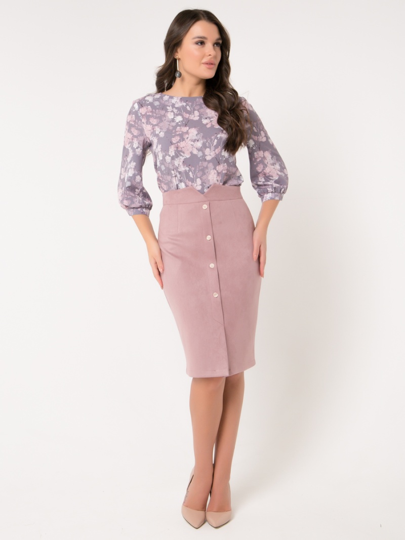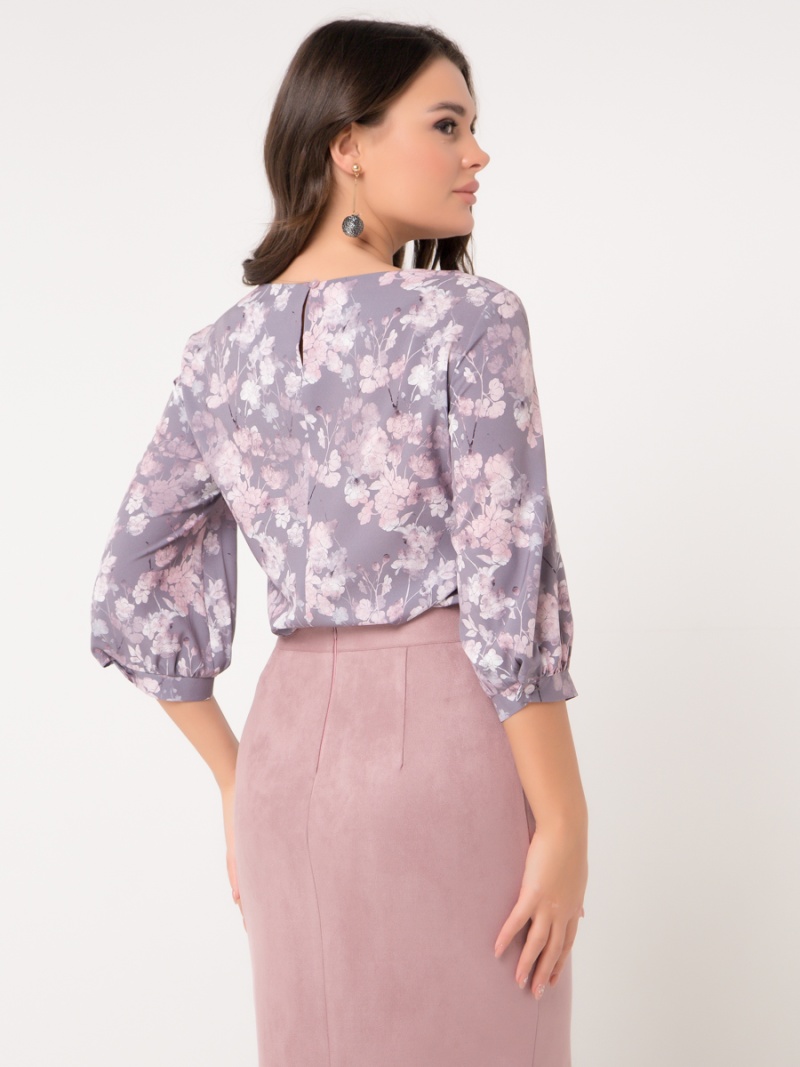 Блузка из тонкой ткани с цветочным принтом, полуприлегающего силуэта. Горловина округлая на обтачке с застежкой-каплей по центру спинки. Рукав втачной 3/4. Низ рукава на манжете с пуговицей. Длина по спинке 62 см.