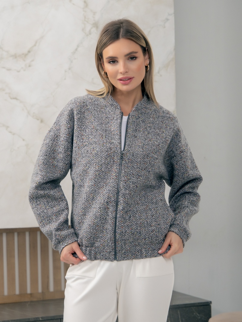 Трикотажный бомбер на молнии без подклада. Силуэт прямой. Рукав спущенный. По горловине воротничок-стойка. Низ изделия на широкой резинке. Длина по спинке 58 см. Будь стильной вместе с одеждой Вишня!
