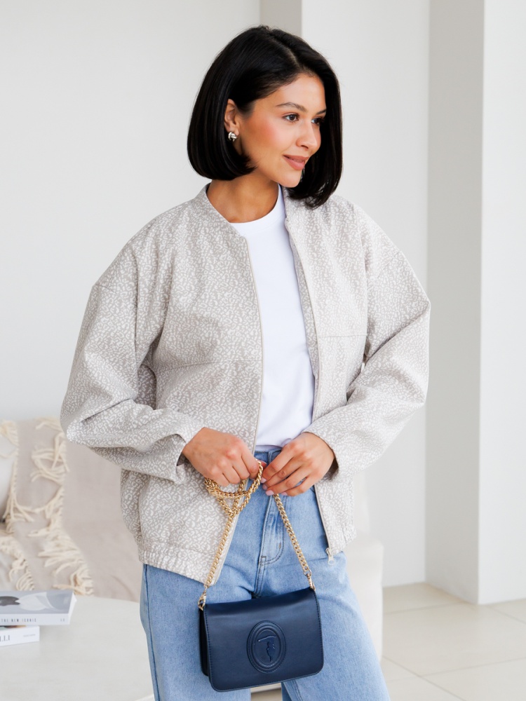 Трикотажный бомбер свободного силуэта без подклада. Воротник стойка. Застежка на молнию. Рукав спущенный. По низу рукава и изделия - защипы. Длина по спинке 61 см. Будь стильной вместе с одеждой Вишня!