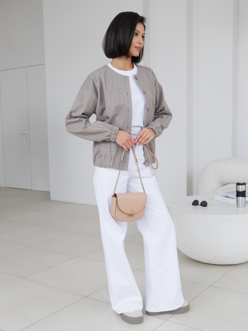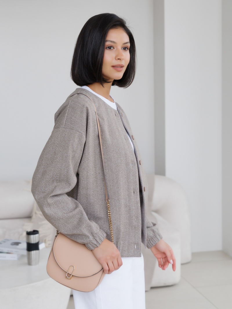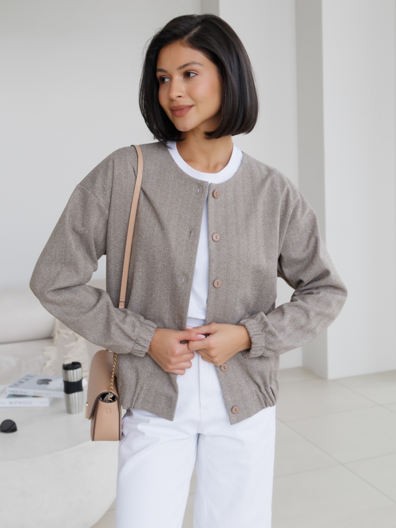 Трикотажный бомбер на пуговицах без подклада с принтом "елочка". Силуэт прямой. Рукав спущенный. Низ рукава и низ изделия на широкой резинке. Длина по спинке 57 см. Будь стильной вместе с одеждой Вишня!