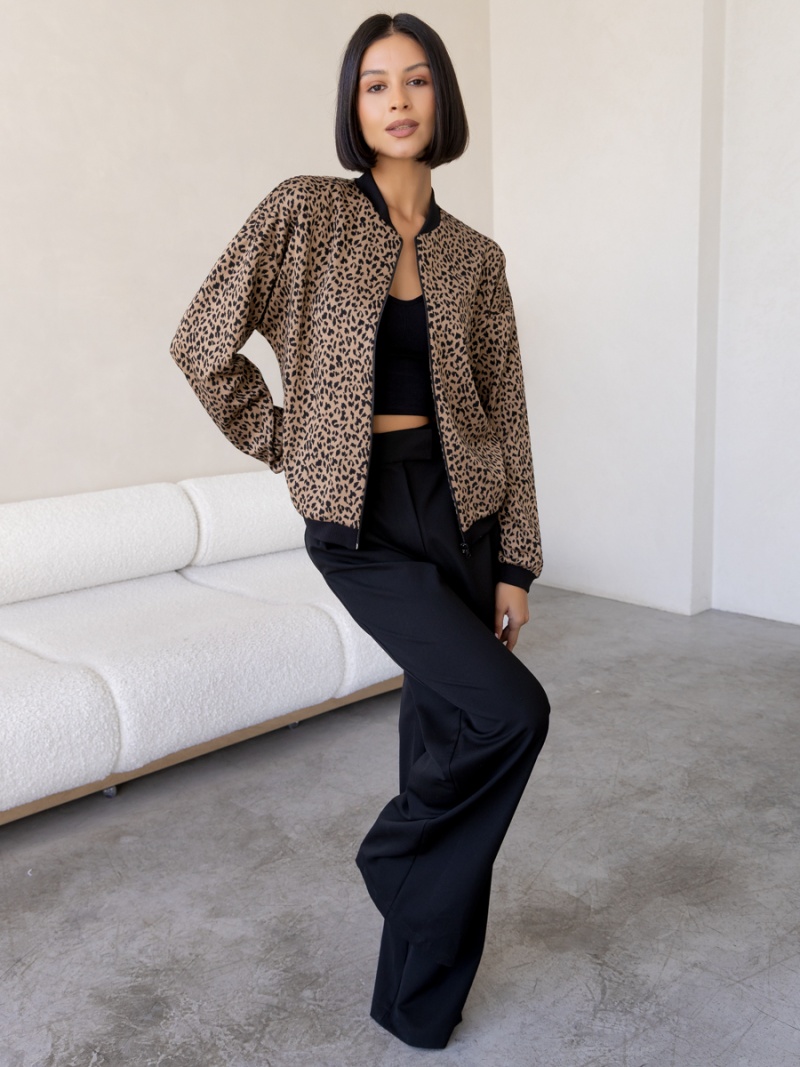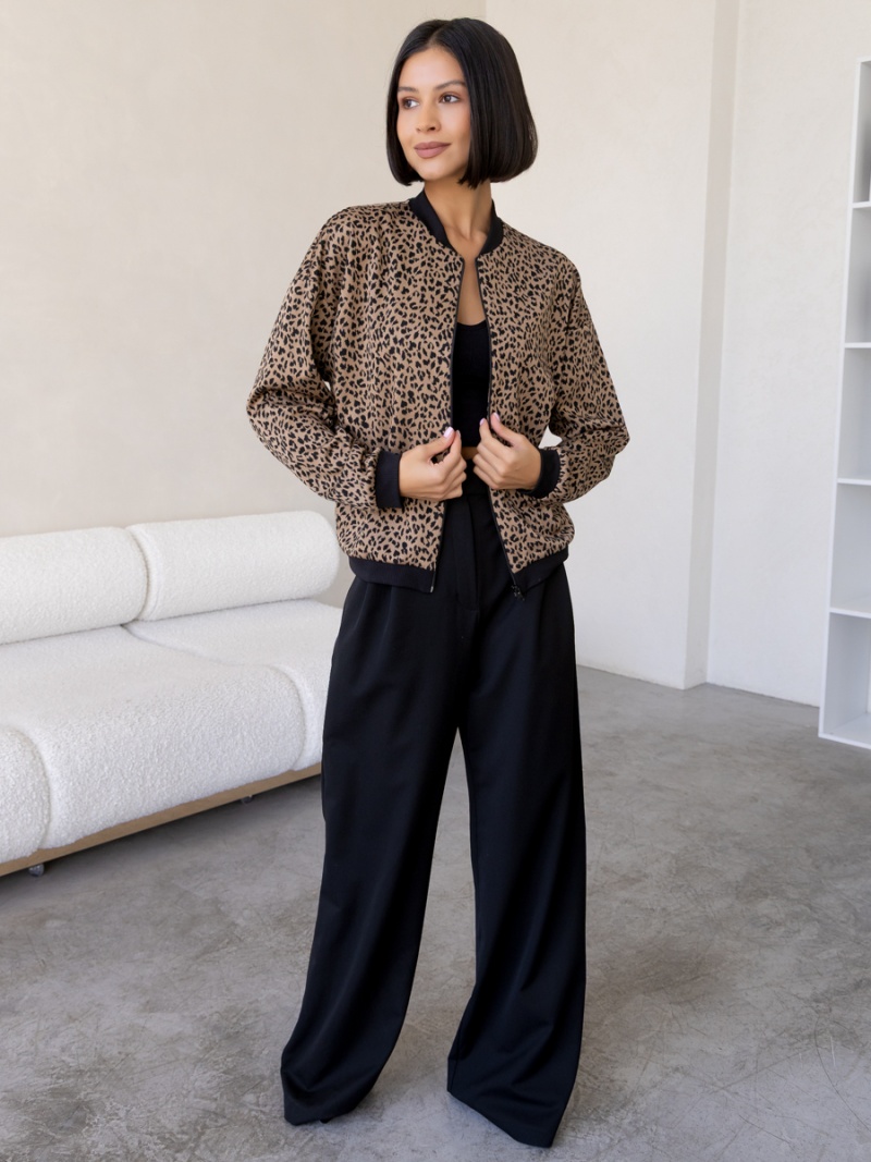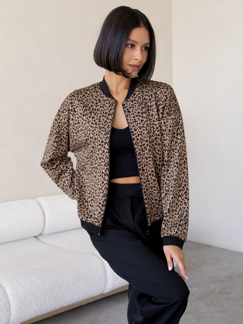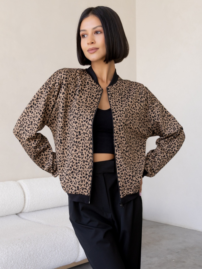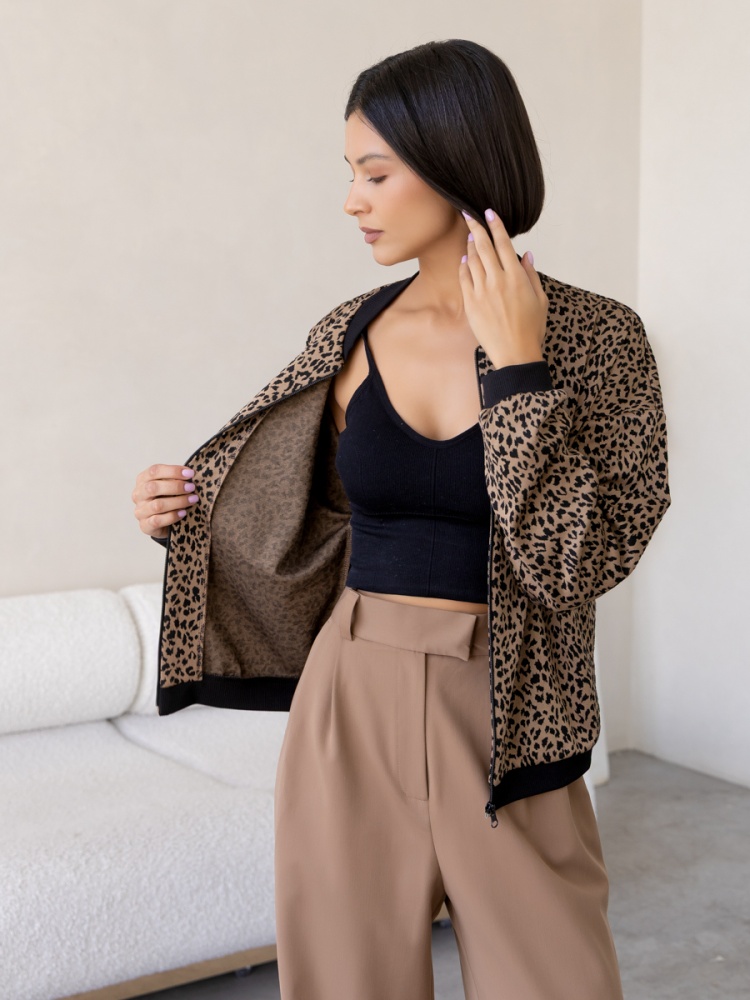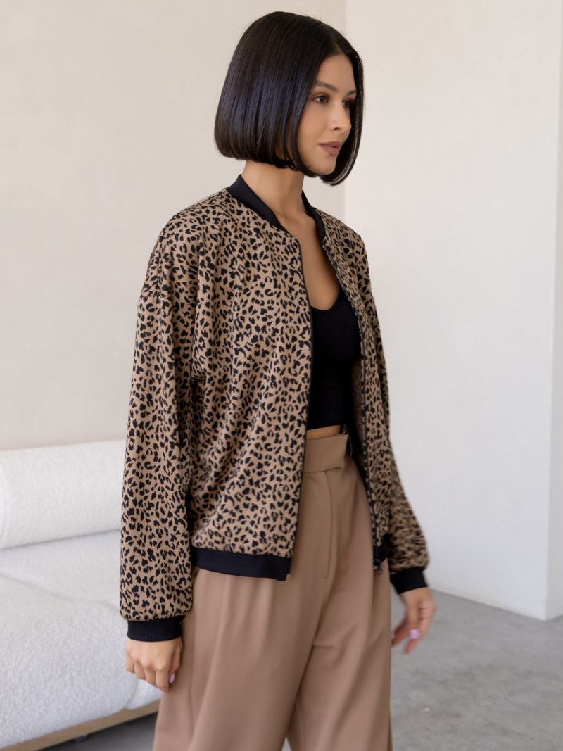 Трикотажный бомбер на молнии без подклада принт "Леопард". Силуэт прямой. Рукав спущенный. Воротничок-стойка, манжеты и пояс из отделочной ткани. Длина по спинке 59 см. Будь стильной вместе с одеждой Вишня!