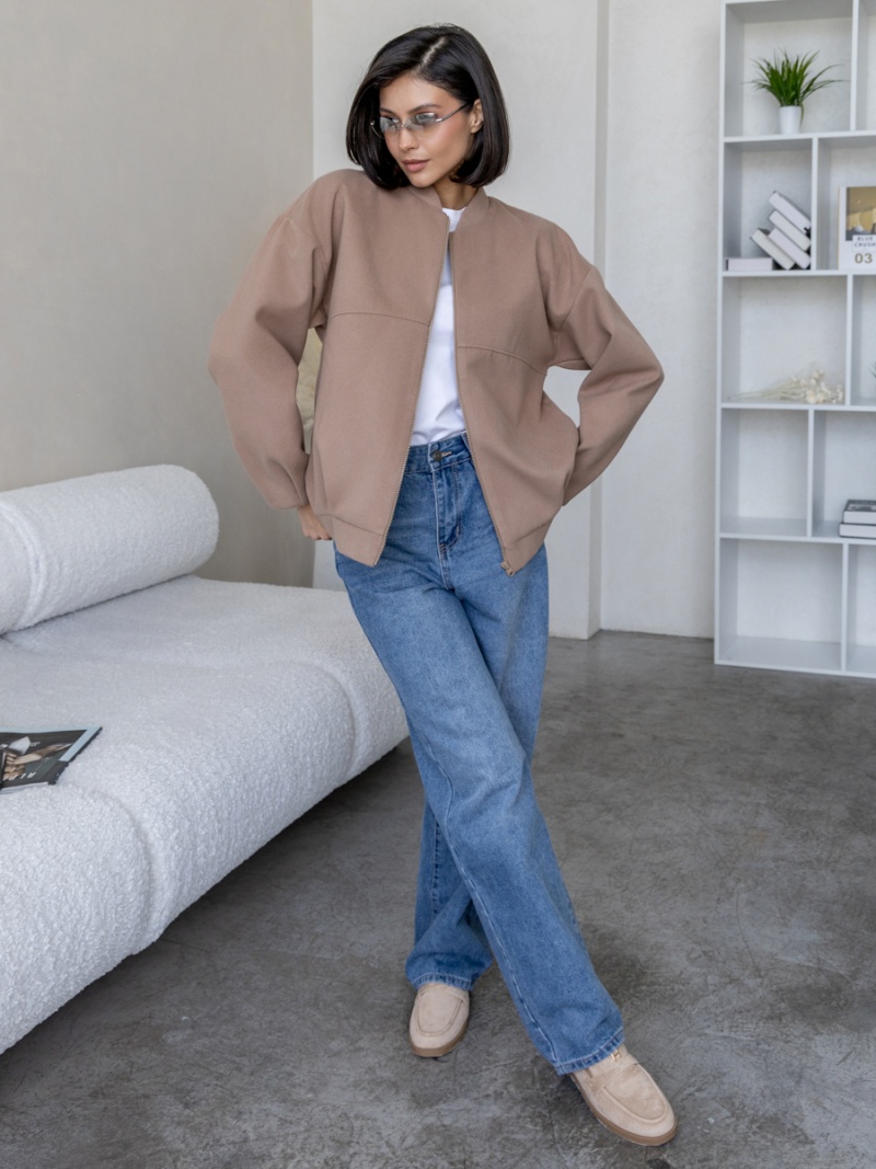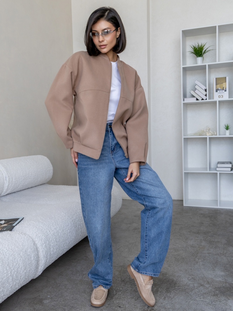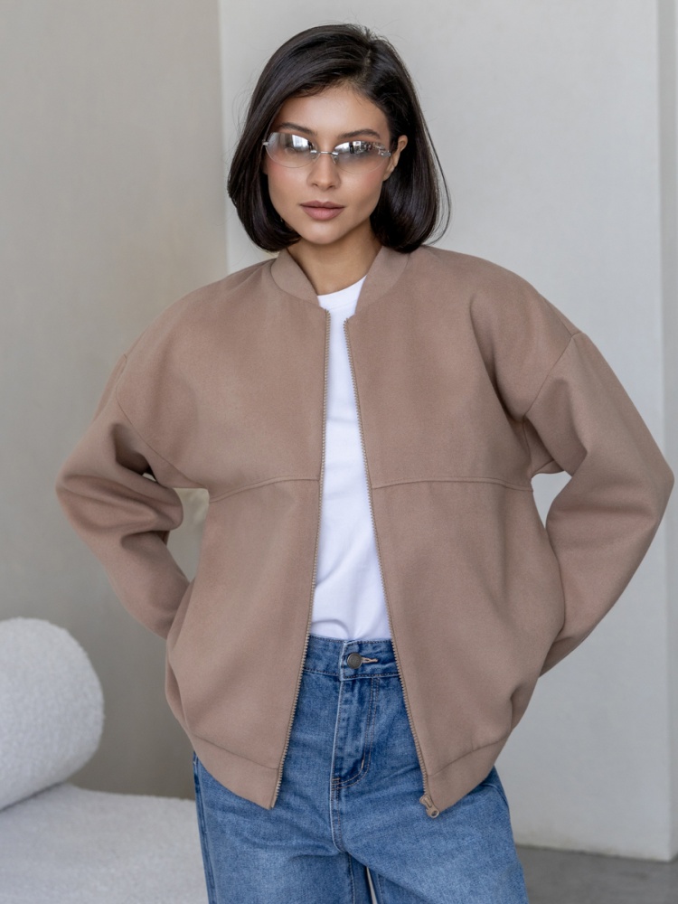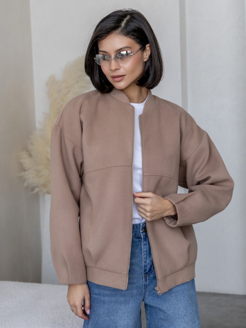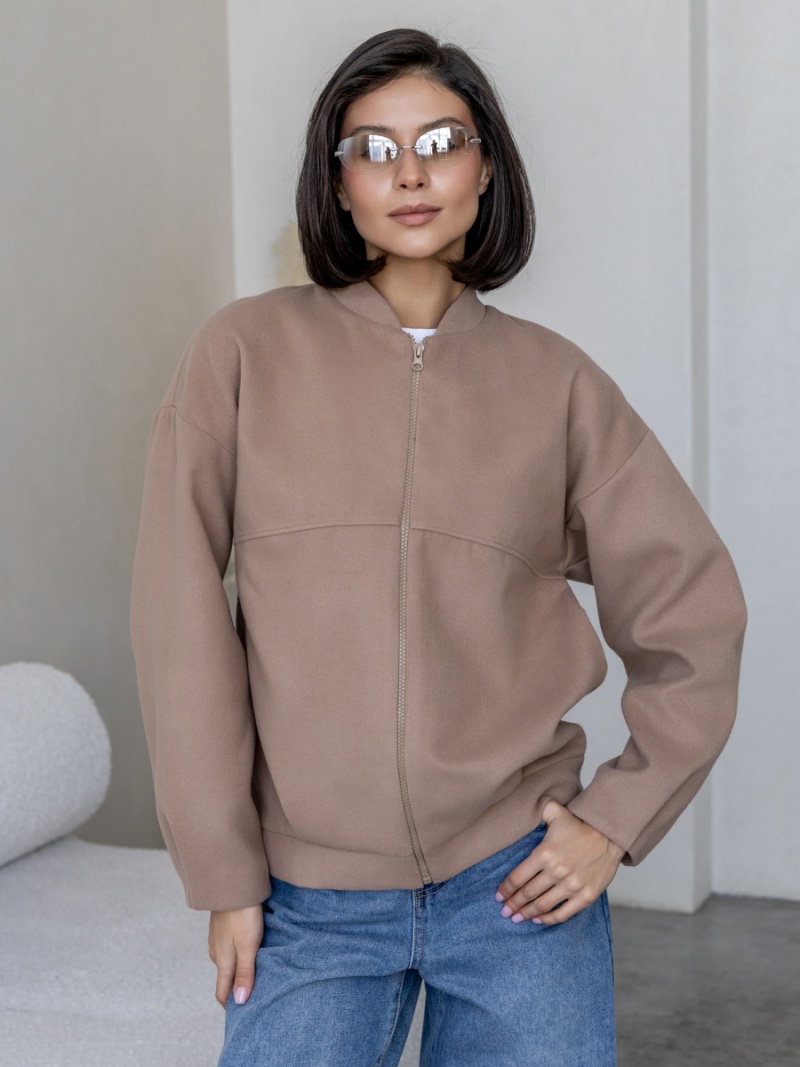Трикотажный бомбер свободного силуэта без подклада. Воротник стойка. Застежка на молнию. Рукав спущенный. По низу рукава и изделия - защипы. Длина по спинке 62 см. Будь стильной вместе с одеждой Вишня!