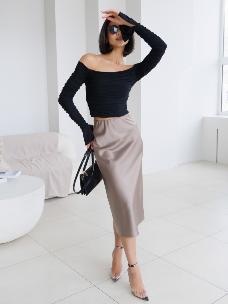 Юбка-колокол на резинке из однотонного шелка-атласа длиной ниже колена. Длина изделия 73см. Будь стильной вместе с одеждой Вишня!