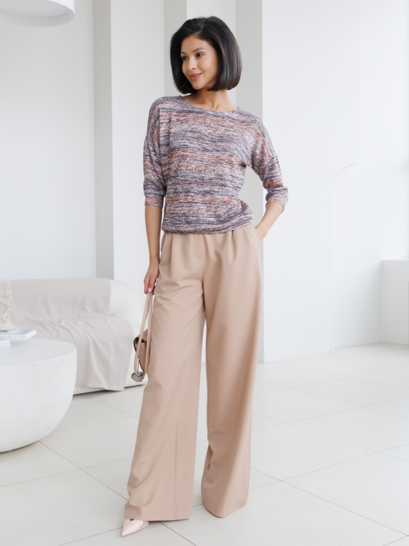 Джемпер из мягкого меланжевого трикотажа. Покрой свободный, плечо немного спущено, за счет чего джемпер красиво драпируется на фигуре и подчеркивает женственность силуэта. Рукав три четверти с манжетой. Низ джемпера собран на пояс. Длина по спинке 55 см. Будь стильной вместе с одеждой Вишня!