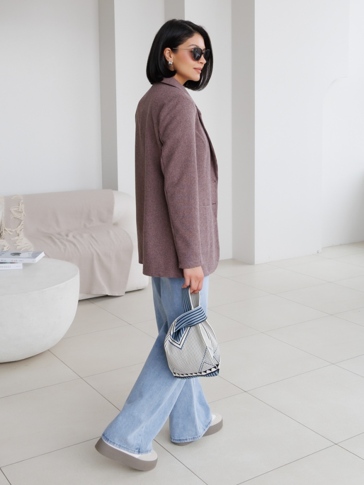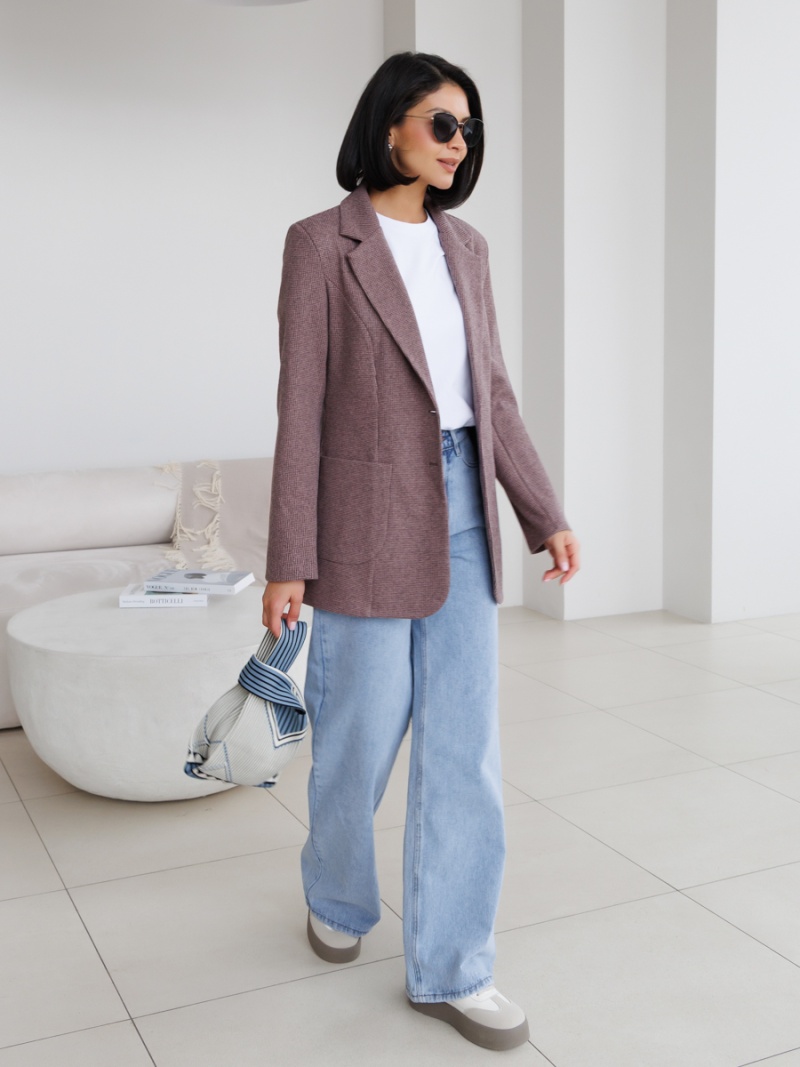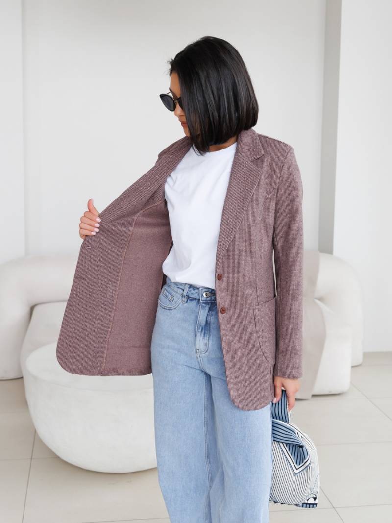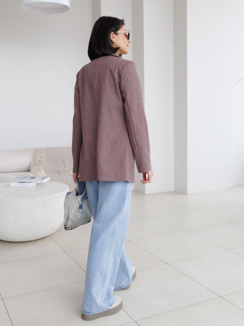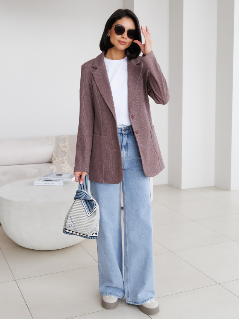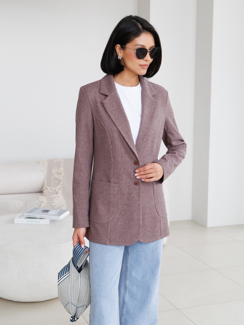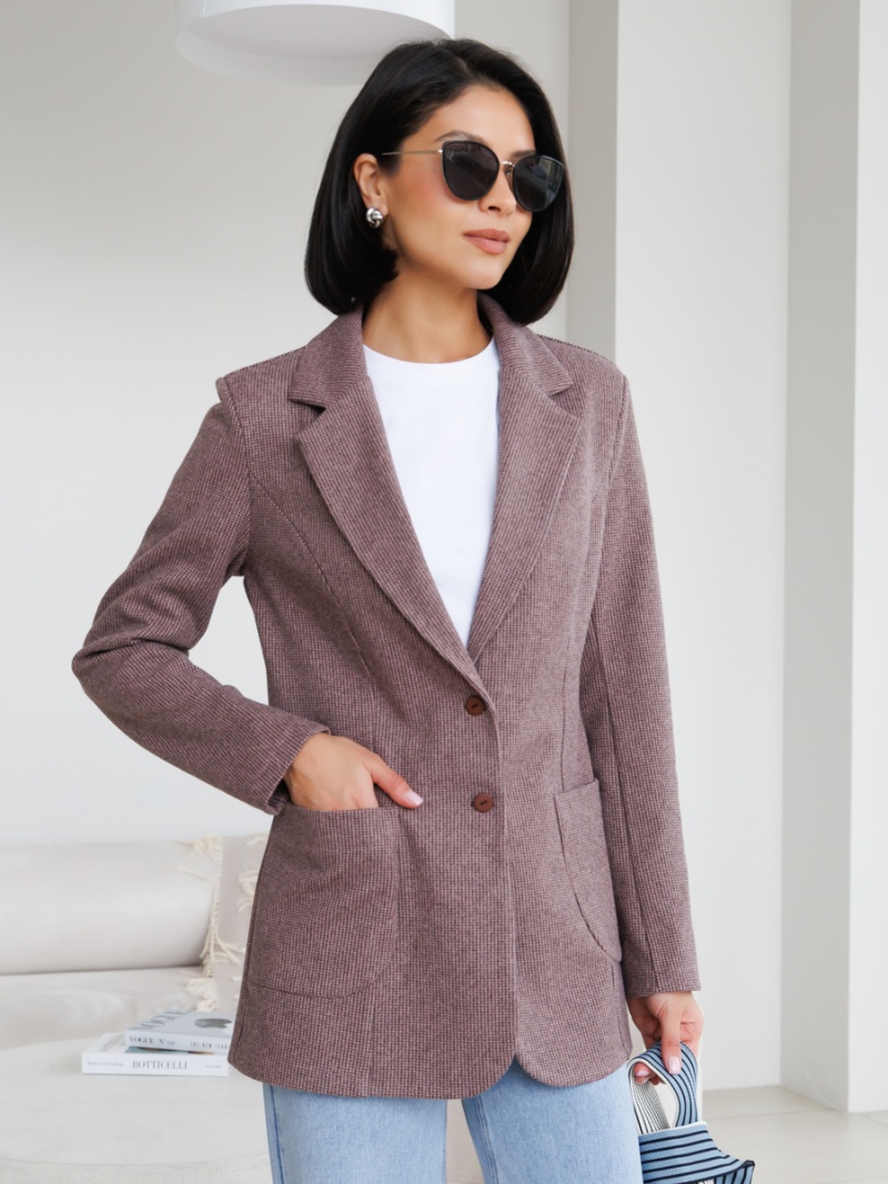 Трикотажный жакет полуприлегающего силуэта, без подкладки. Рукав втачной. Воротник отложной с лацканом. Спереди застежка на две пуговицы. Накладные карманы. Длина по спинке 73 см. Будь стильной вместе с одеждой Вишня!