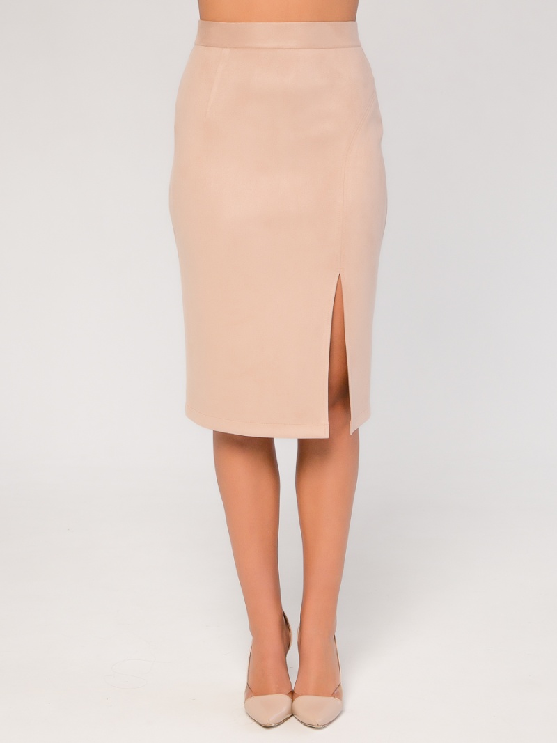 Юбка-карандаш облегающего силуэта. Выполнена из плотной и эластичной эко-замши, которая незначительно растягивается и за счет этого идеально садится по фигуре. Верх юбки на поясе, посадка четко по талии. Разрез в левом рельефном шве. На спинке застежка-молния. Длина по спинке 62 см.