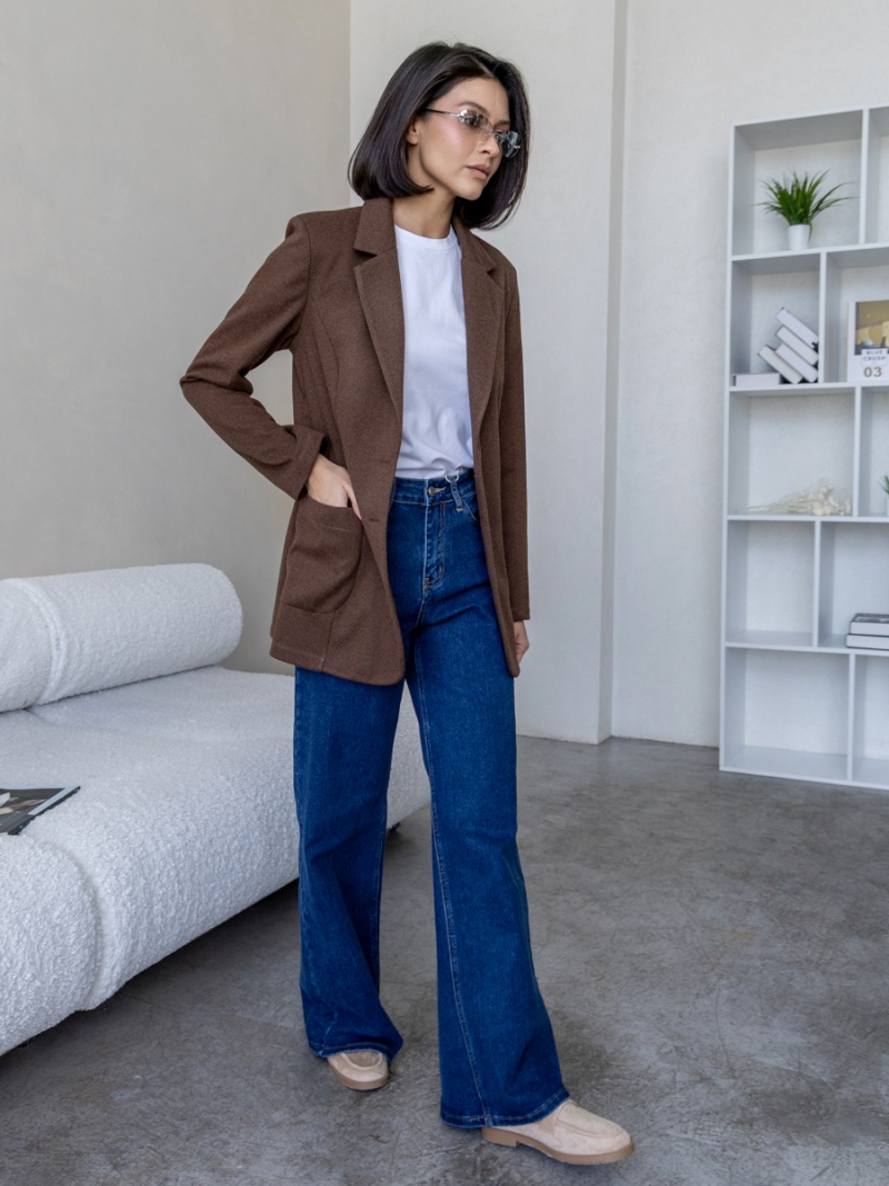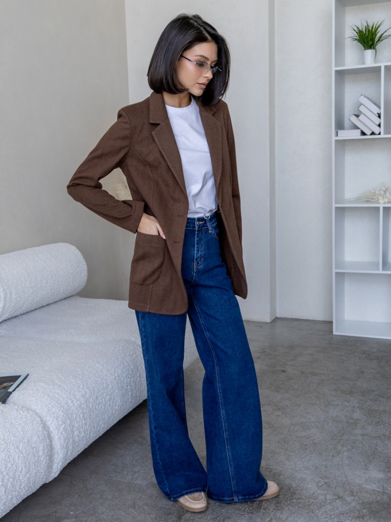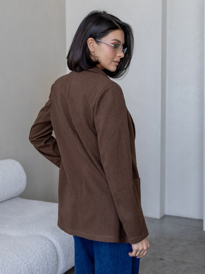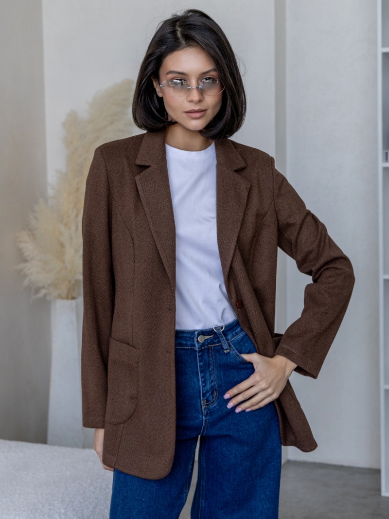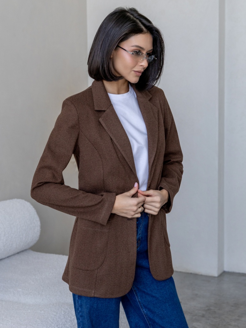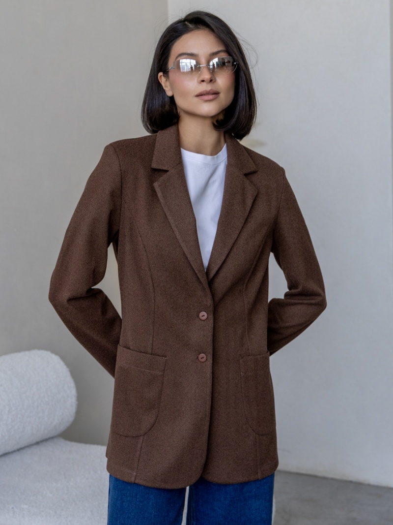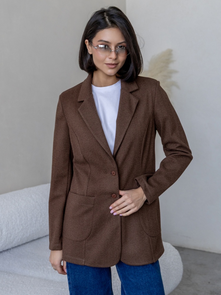 Трикотажный жакет полуприлегающего силуэта, без подкладки. Рукав втачной. Воротник отложной с лацканом. Спереди застежка на две пуговицы. Накладные карманы. Длина по спинке 72 см. Будь стильной вместе с одеждой Вишня!