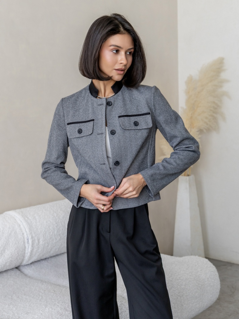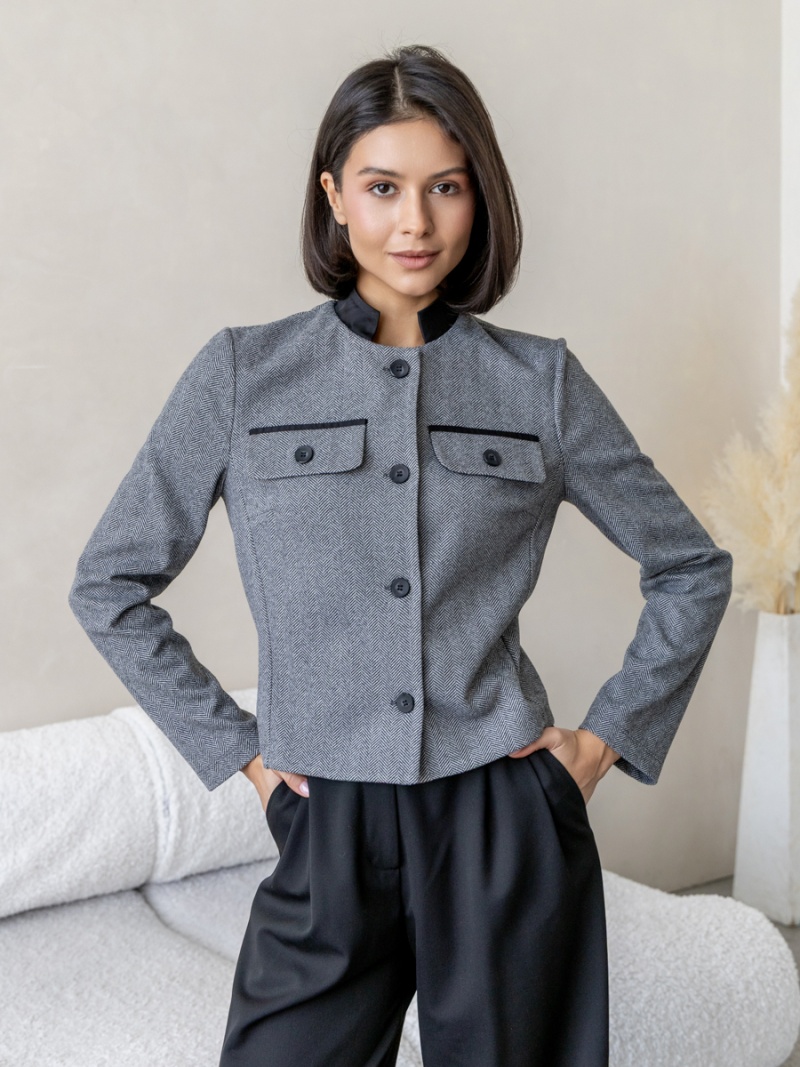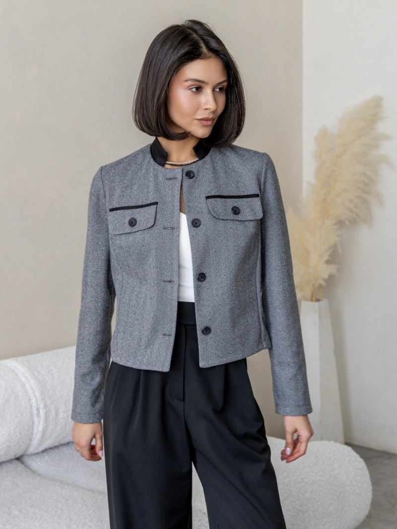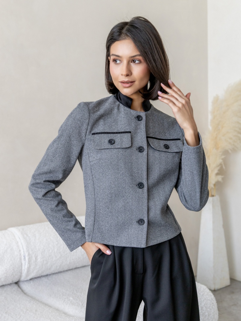 Укороченный жакет из мягкого трикотажа "елочка" полуприлегающего силуэта, рукав втачной. Спереди застежка на пуговицы. Отделкой служат декоративные клапаны по переду. Воротник-стойка. Длина по спинке 50 см. Будь стильной вместе с одеждой Вишня!