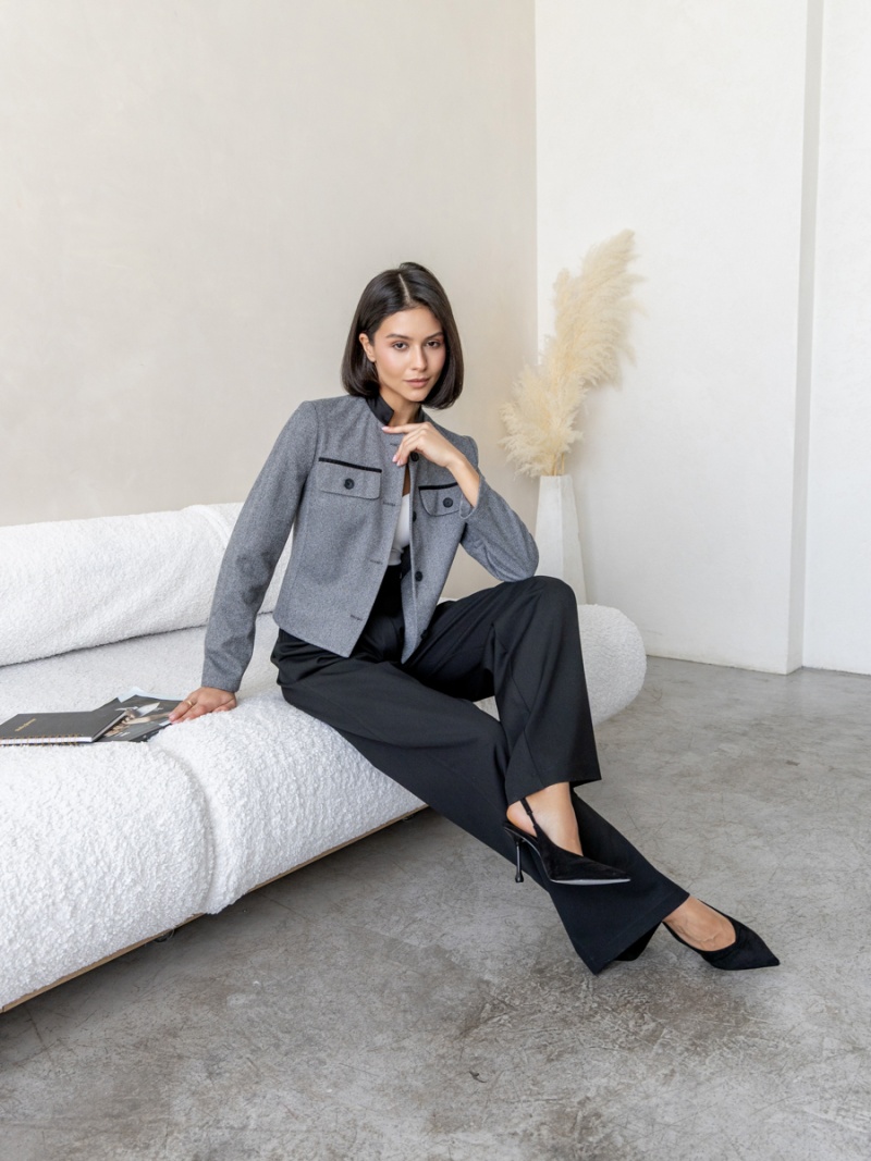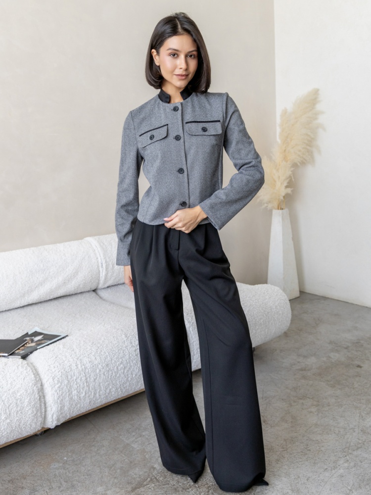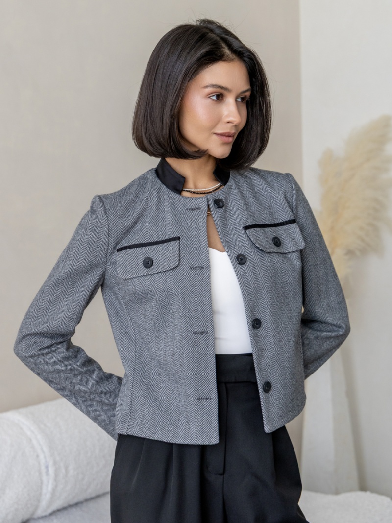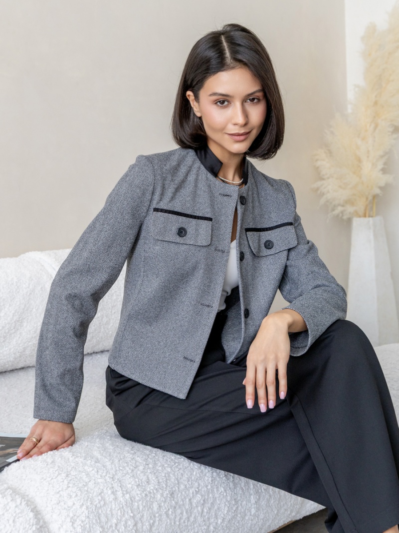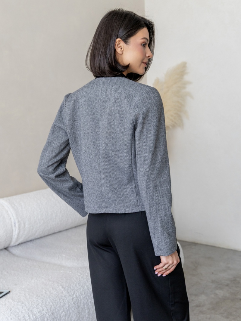 Укороченный жакет из мягкого трикотажа "елочка" полуприлегающего силуэта, рукав втачной. Спереди застежка на пуговицы. Отделкой служат декоративные клапаны по переду. Воротник-стойка. Длина по спинке 50 см. Будь стильной вместе с одеждой Вишня!