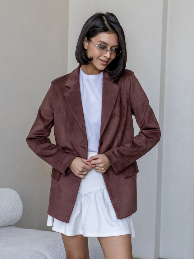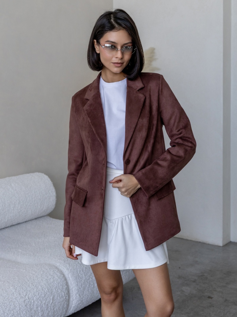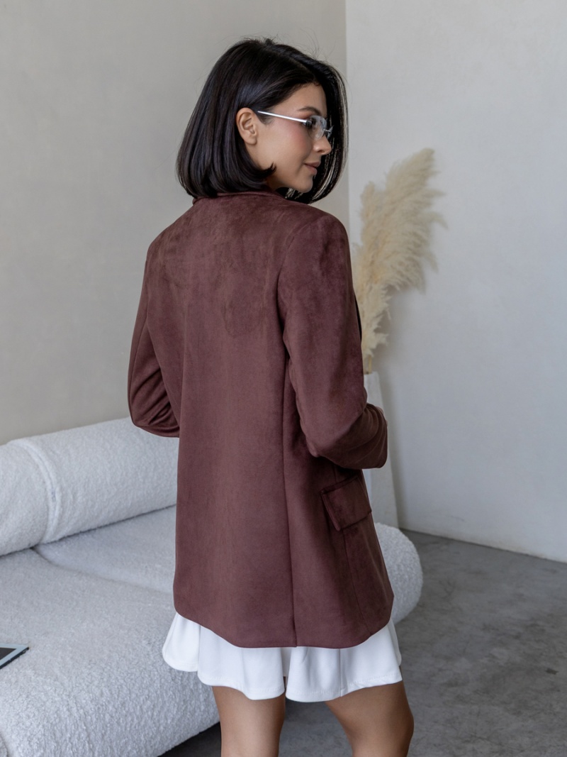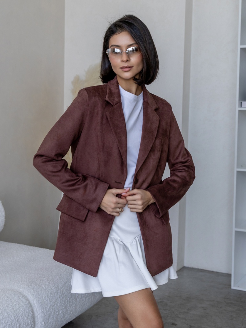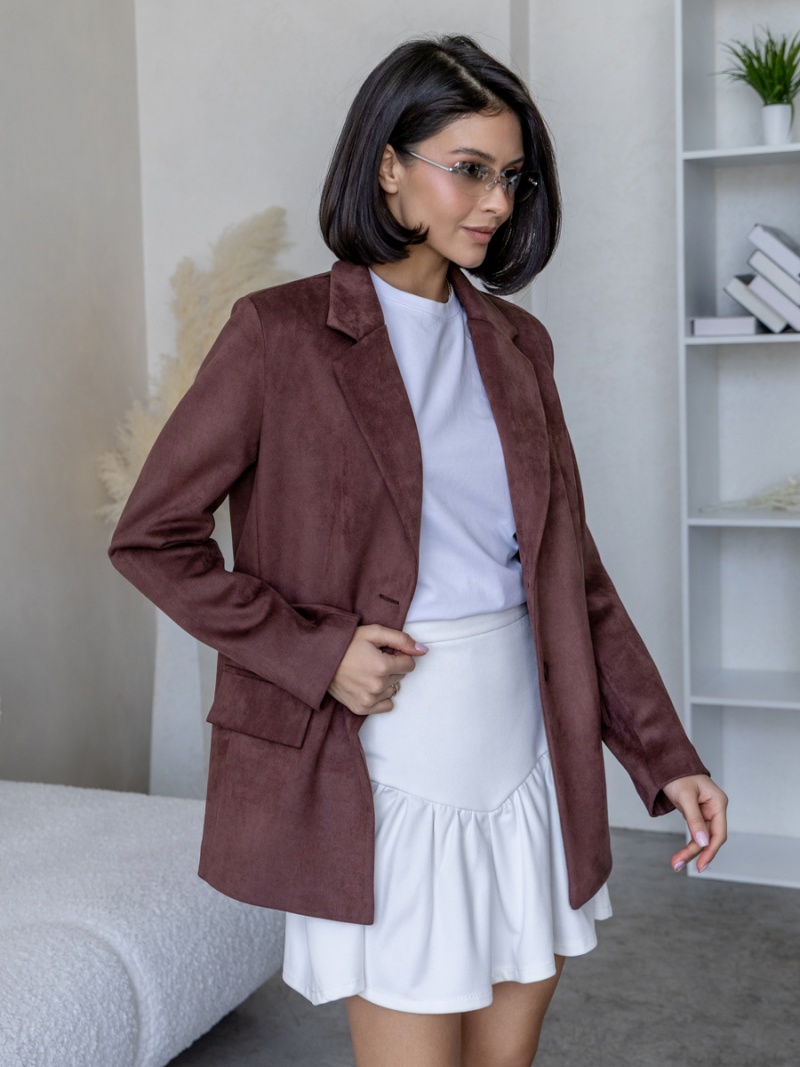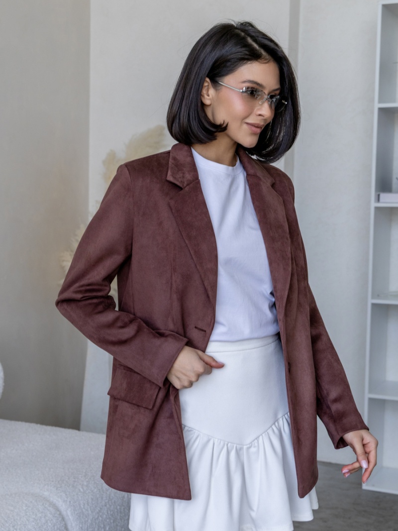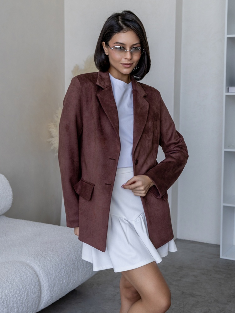 Жакет из плотной эко-замши полуприлегающего силуэта на подкладке. Рукав втачной, двухшовный. Воротник отложной с лацканом. Отделкой служат декоративные клапана по переду. Застежка на петли и пуговицы. Длина по спинке 69 см. Будь стильной вместе с одеждой Вишня!