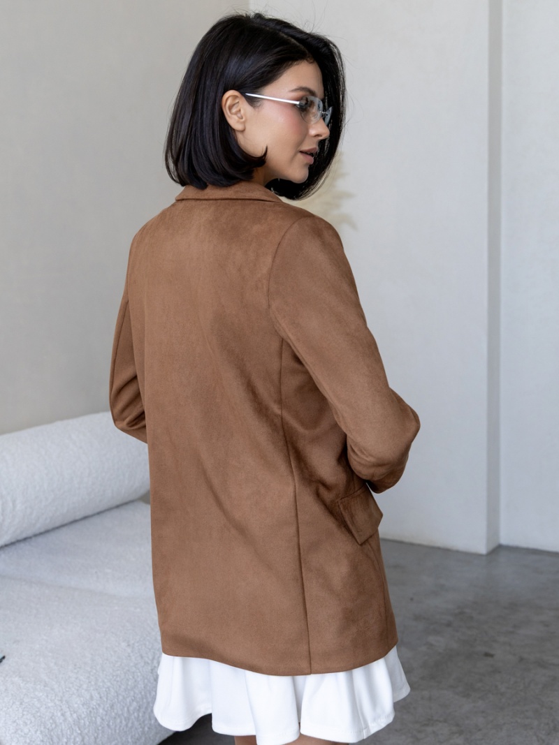 Жакет из плотной эко-замши полуприлегающего силуэта на подкладке. Рукав втачной, двухшовный. Воротник отложной с лацканом. Отделкой служат декоративные клапана по переду. Застежка на петли и пуговицы. Длина по спинке 69 см. Будь стильной вместе с одеждой Вишня!