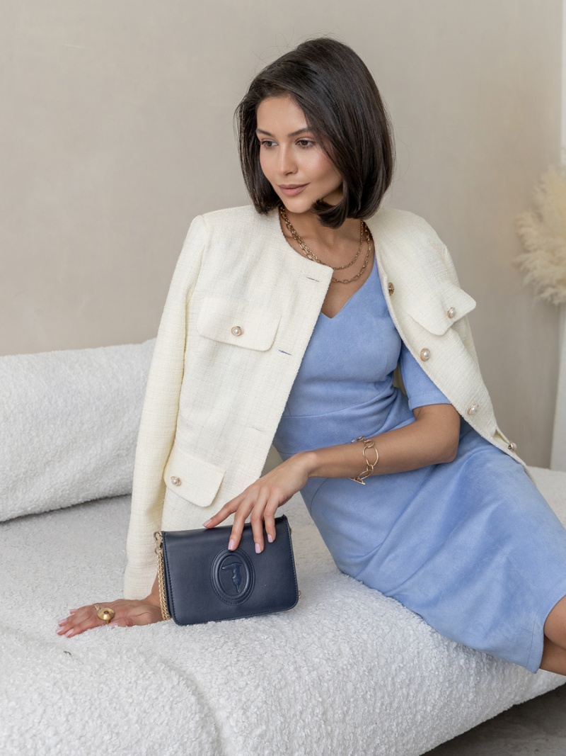 Укороченный жакет из костюмной ткани полуприлегающего силуэта на подкладке. Спереди застежка на пуговицы. Отделкой служат декоративные клапаны по переду. Длина по спинке 51 см. Будь стильной вместе с одеждой Вишня!