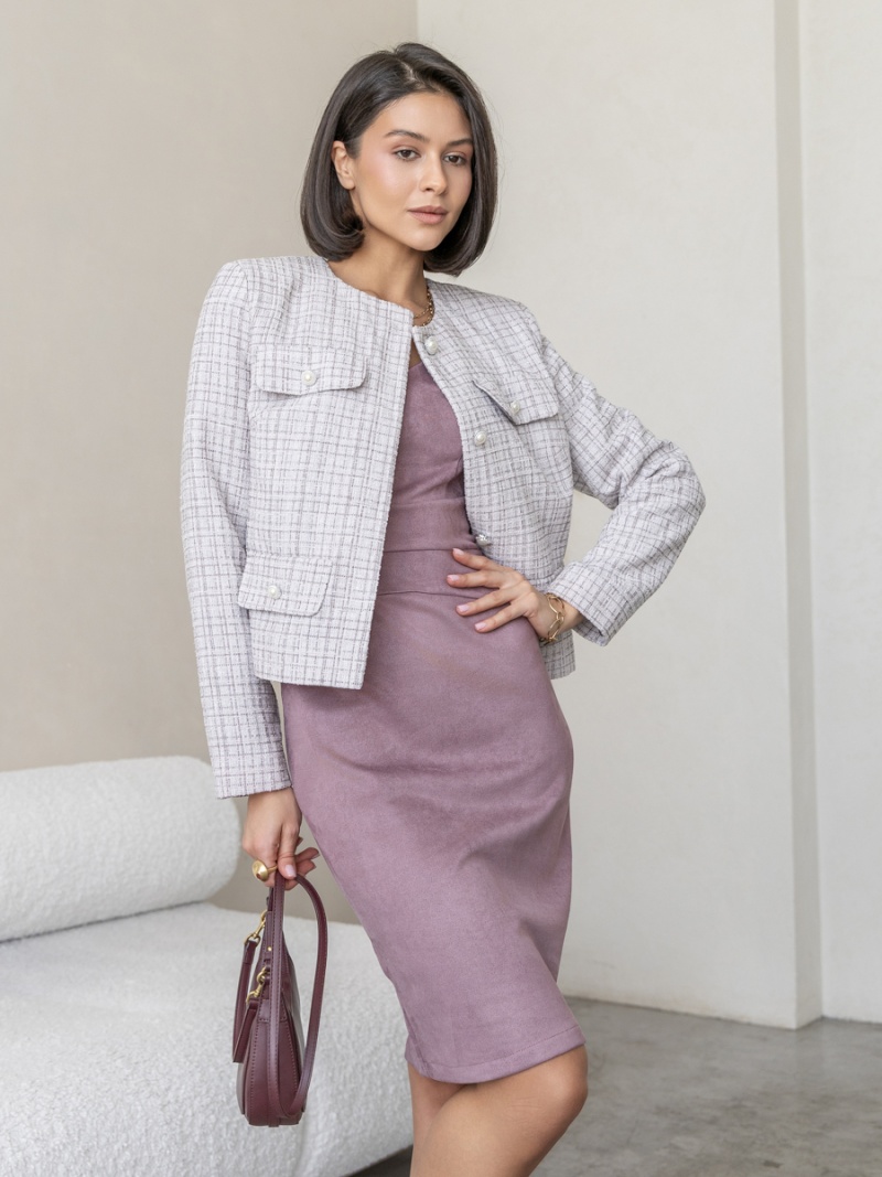 Укороченный жакет из костюмной ткани полуприлегающего силуэта на подкладке. Спереди застежка на пуговицы. Отделкой служат декоративные клапаны по переду. Длина по спинке 51 см. Будь стильной вместе с одеждой Вишня!