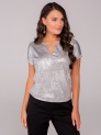 Блуза прямого силуэта со спущенным рукавом. Выполнена из эластичной ткани с блеском и эффектом «мрамора». Низ блузы на поясе. Длина по спинке 56 см.