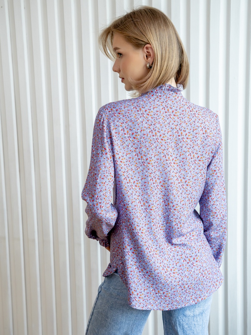 Блузка из штапеля с цветочным принтом. Силуэт полуприлегающий. Рукав втачной с оборкой на манжете и по воротнику-стойке. По боковым швам разрезы, низ закругленный. Блузку можно носить как заправленной, так и навыпуск с брюками или джинсами. Длина по спинке 70 см. Будь стильной вместе с одеждой Вишня!