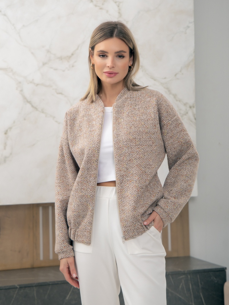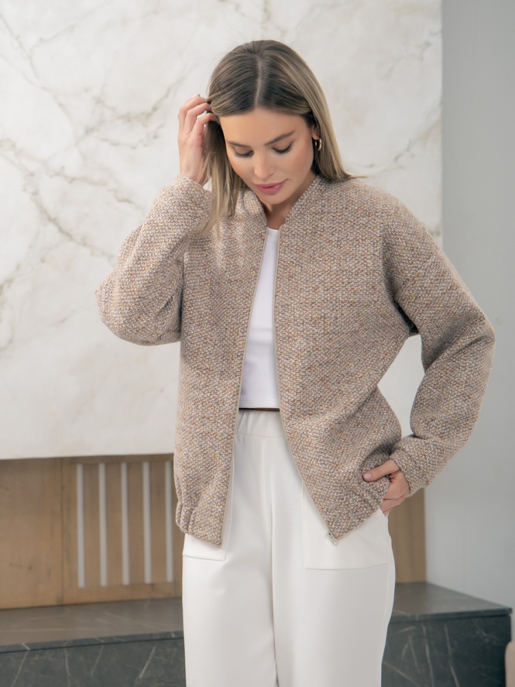 Трикотажный бомбер на молнии без подклада. Силуэт прямой. Рукав спущенный. По горловине воротничок-стойка. Низ изделия на широкой резинке. Длина по спинке 58 см. Будь стильной вместе с одеждой Вишня!