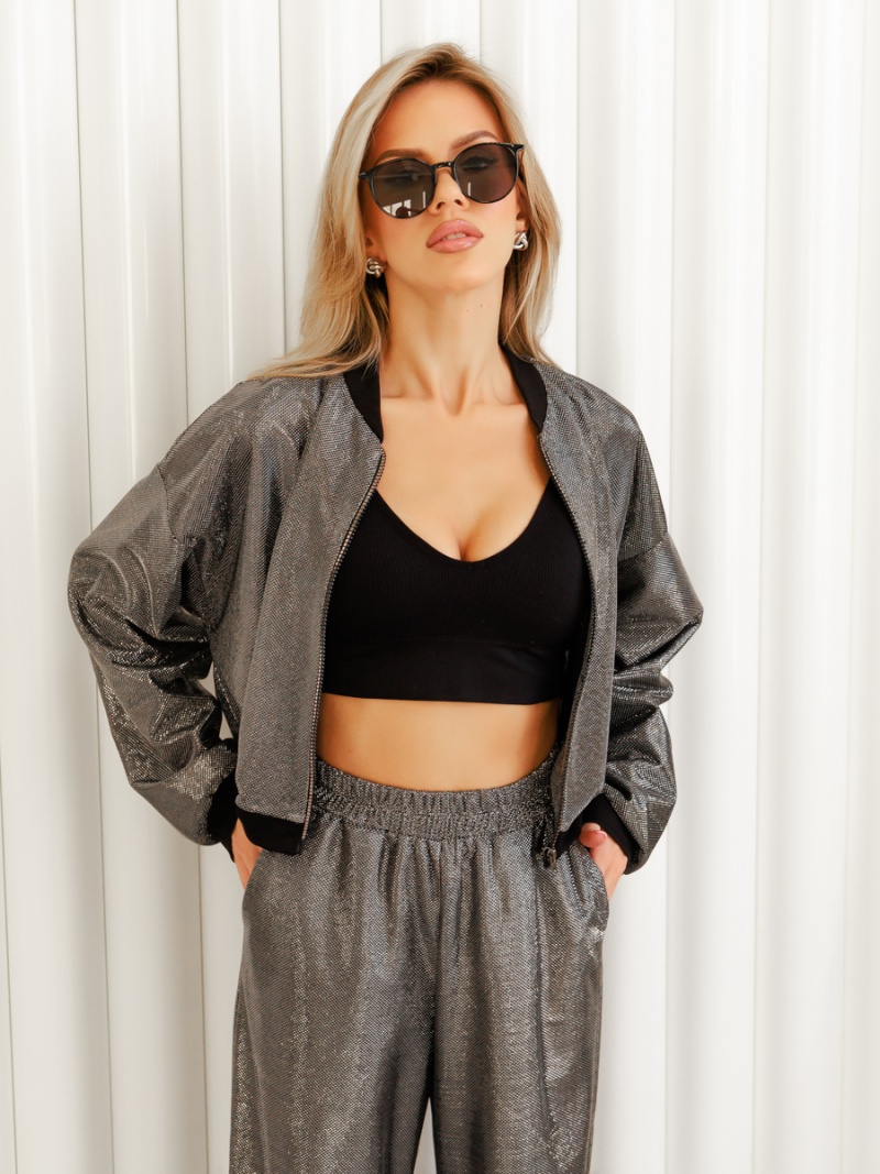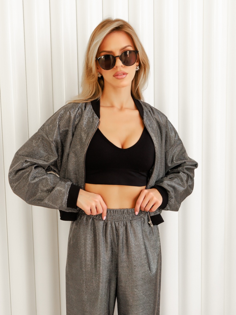 Укороченный бомбер свободного силуэта "металлик". Рукав спущенный, на манжете. Застежка на молнию. Воротник-стойка. Декоративной отделкой служат пояс, манжеты и воротник. Для удобства комплектации образа Вы можете выбрать "низ" из нашей новой коллекции - брюки прямого силуэта "металлик", выполненные из этой же ткани. Длина по спинке без воротника 41 см. Будь стильной вместе с одеждой Вишня!