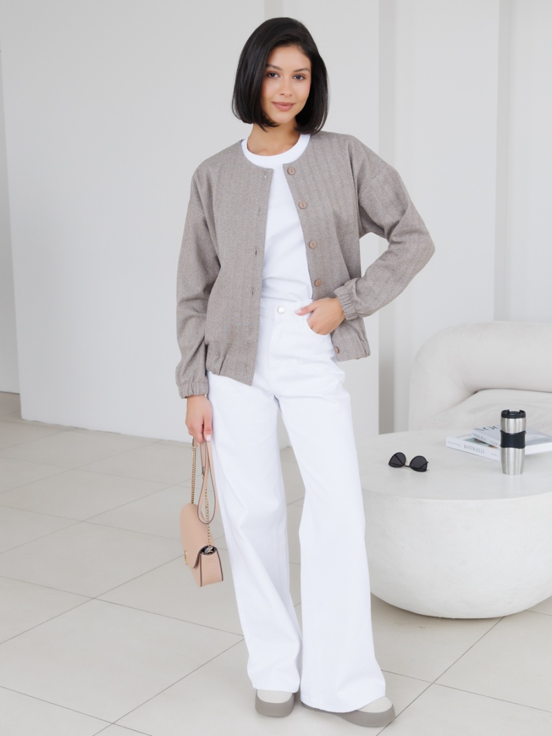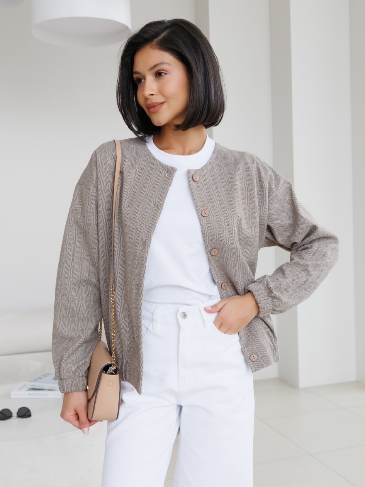 Трикотажный бомбер на пуговицах без подклада с принтом "елочка". Силуэт прямой. Рукав спущенный. Низ рукава и низ изделия на широкой резинке. Длина по спинке 57 см. Будь стильной вместе с одеждой Вишня!