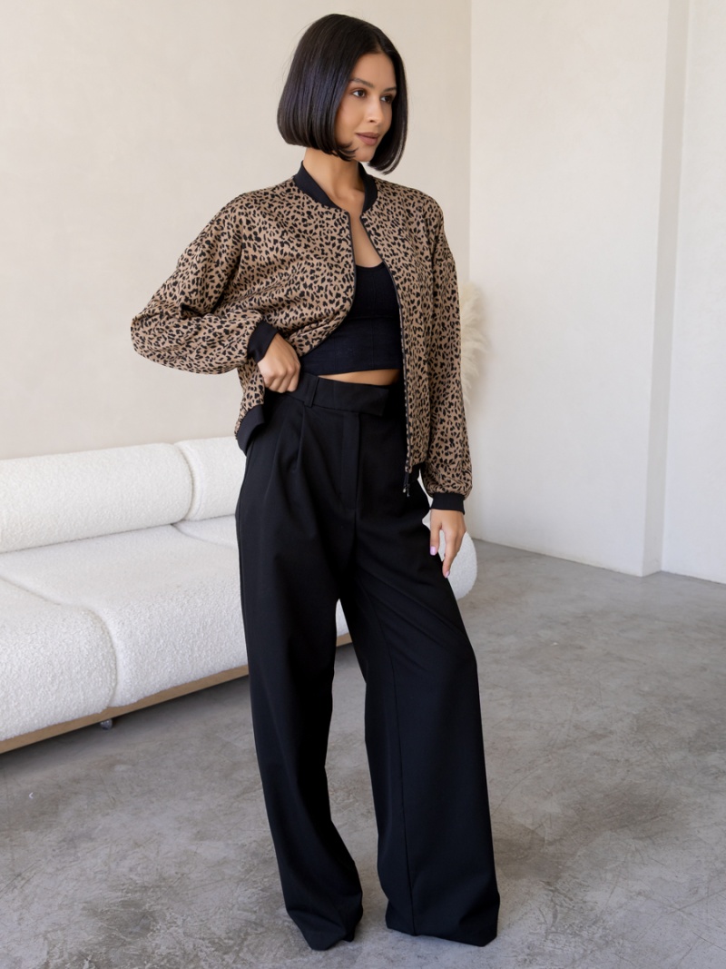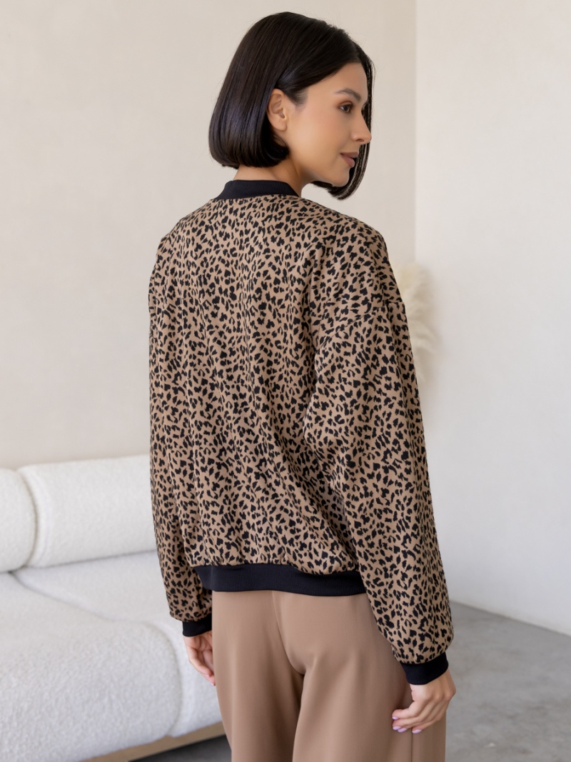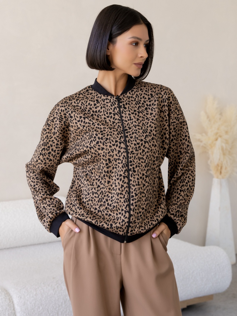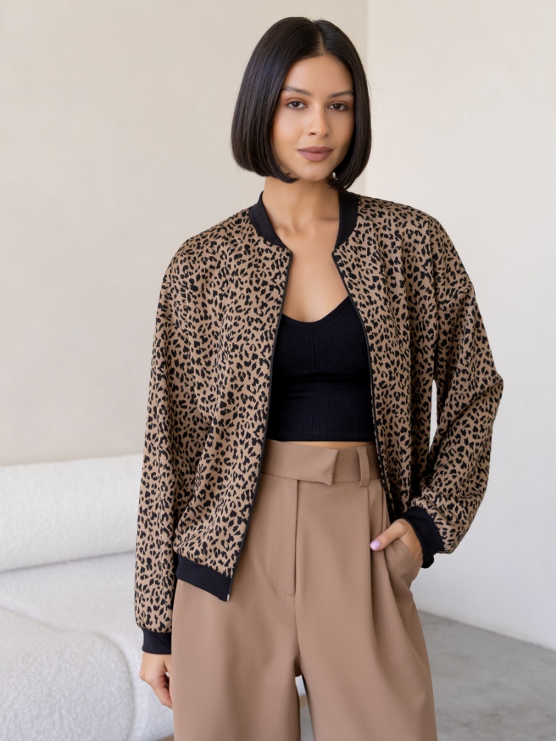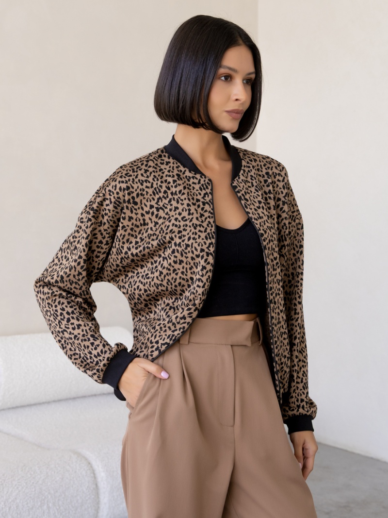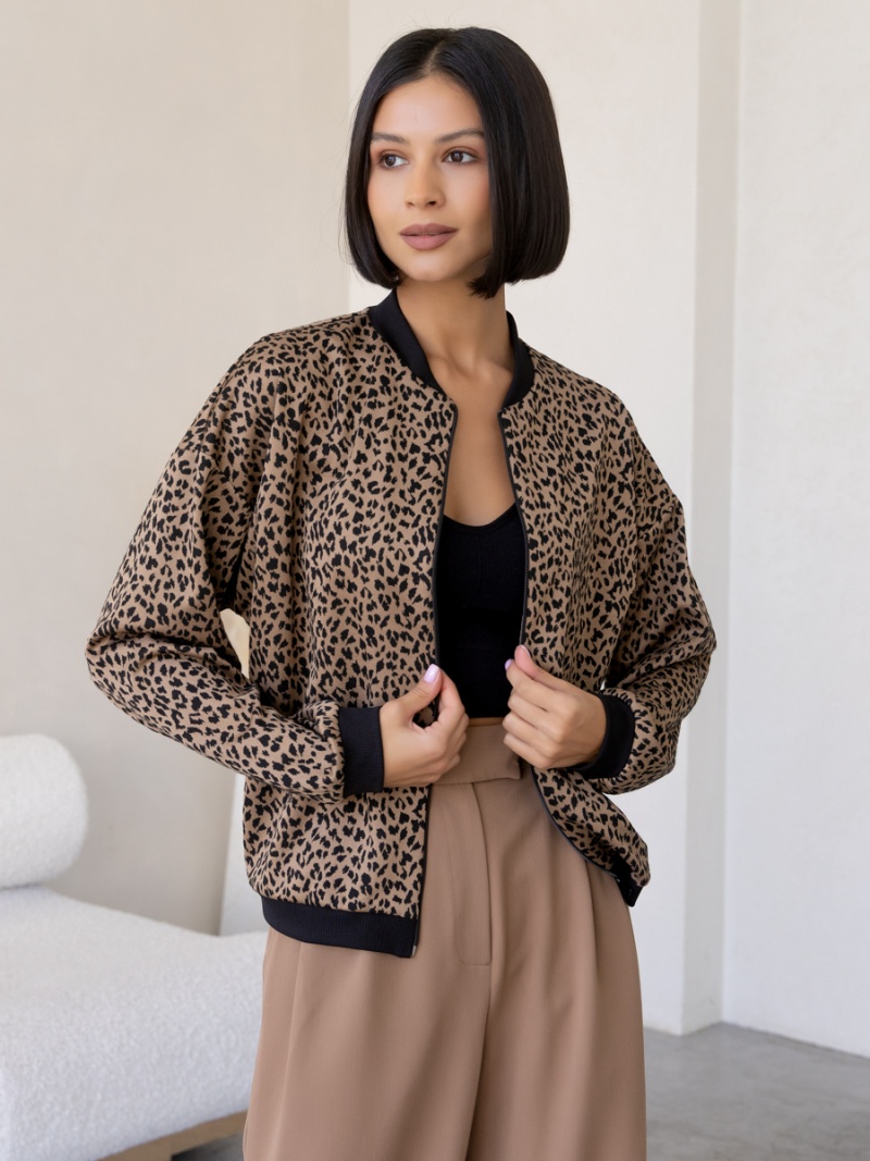 Трикотажный бомбер на молнии без подклада принт "Леопард". Силуэт прямой. Рукав спущенный. Воротничок-стойка, манжеты и пояс из отделочной ткани. Длина по спинке 59 см. Будь стильной вместе с одеждой Вишня!
