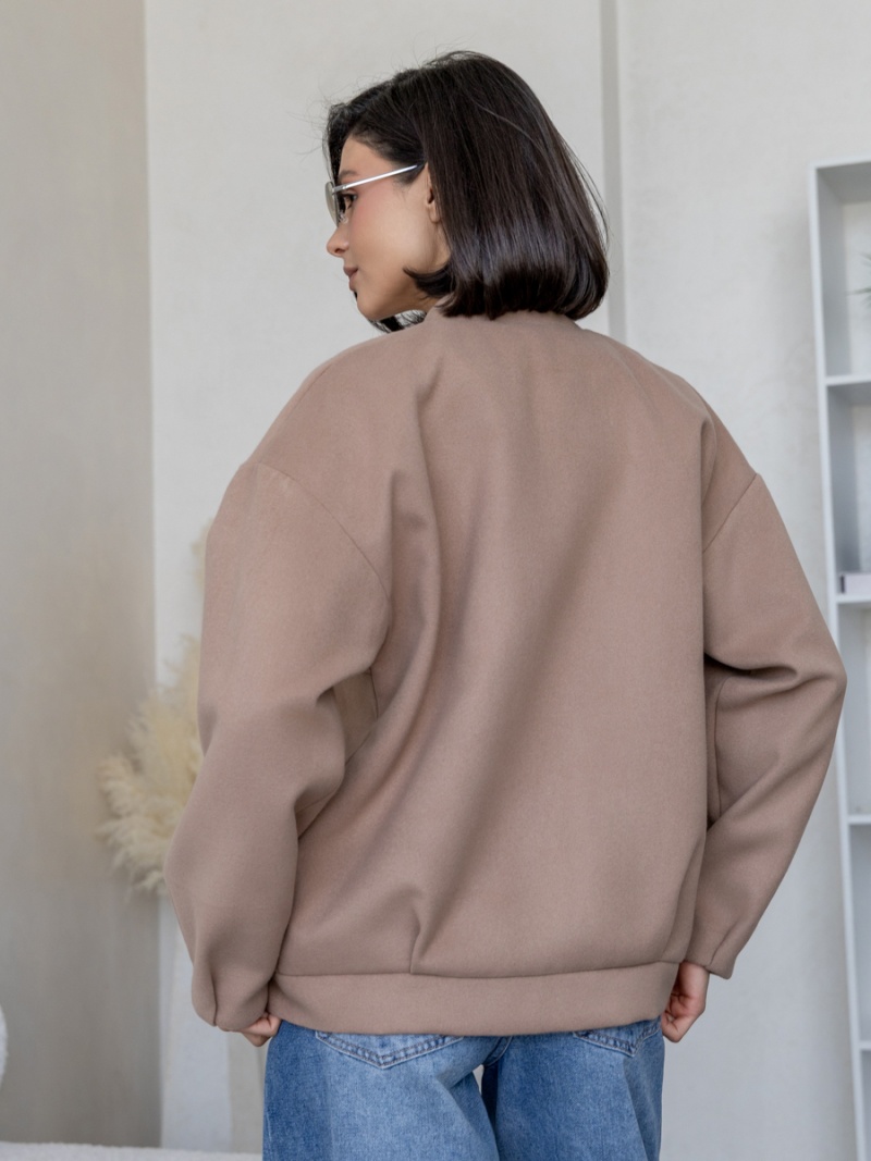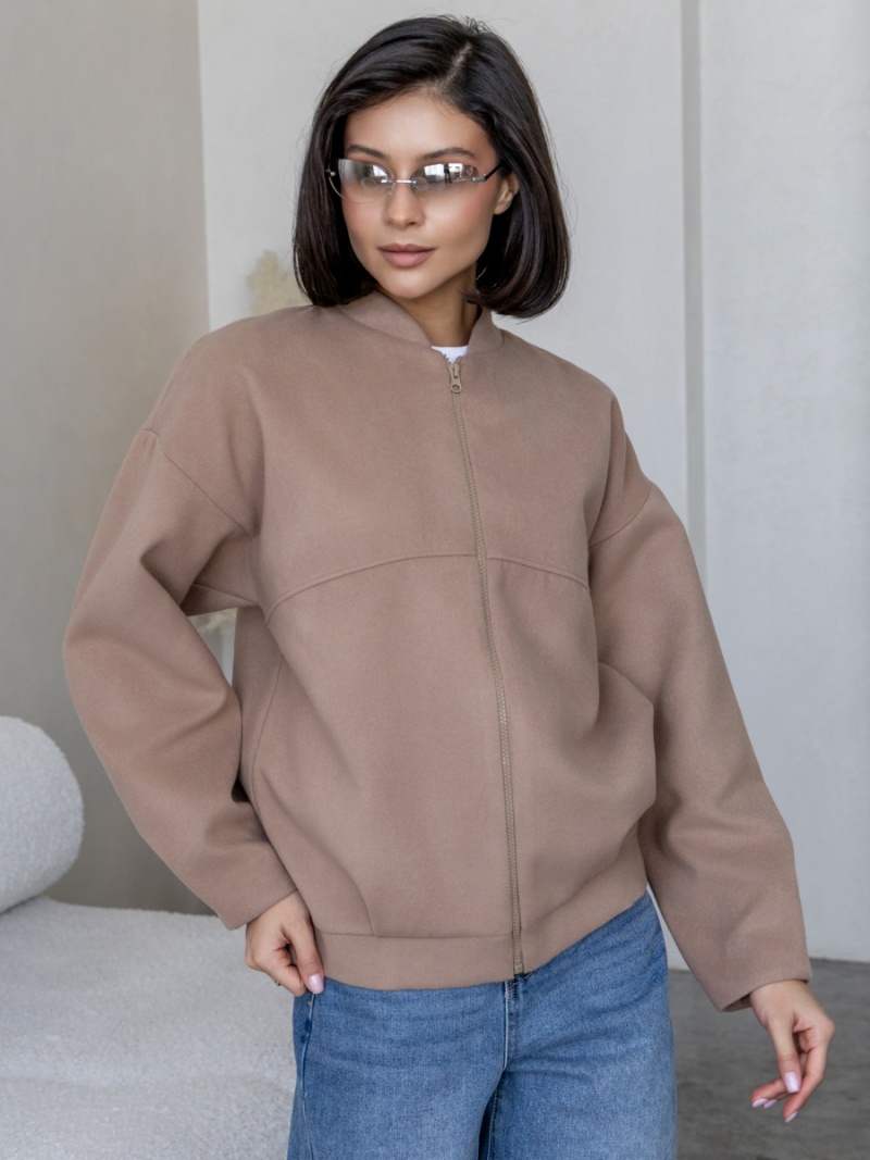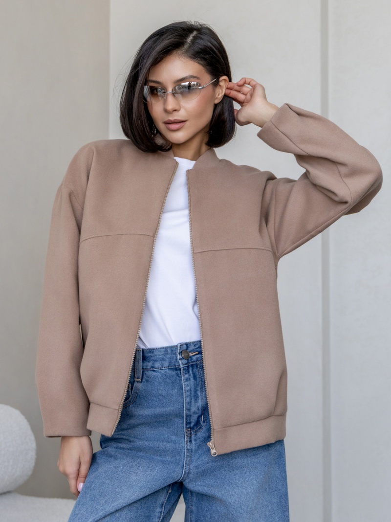 Трикотажный бомбер свободного силуэта без подклада. Воротник стойка. Застежка на молнию. Рукав спущенный. По низу рукава и изделия - защипы. Длина по спинке 62 см. Будь стильной вместе с одеждой Вишня!