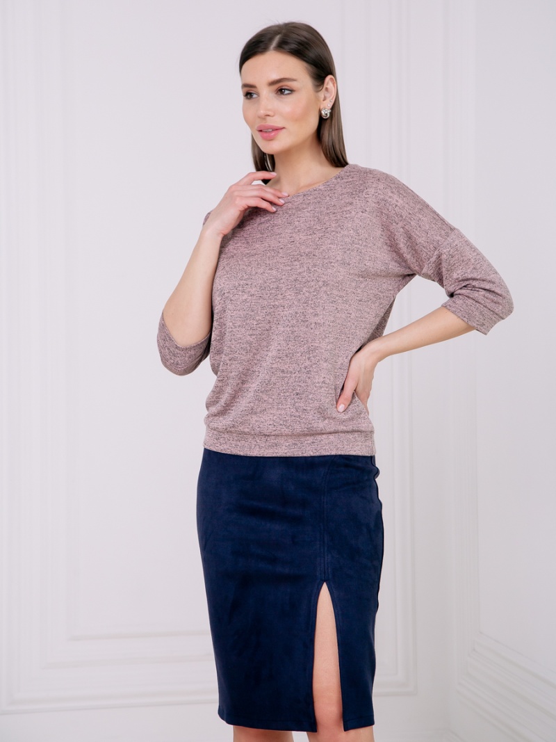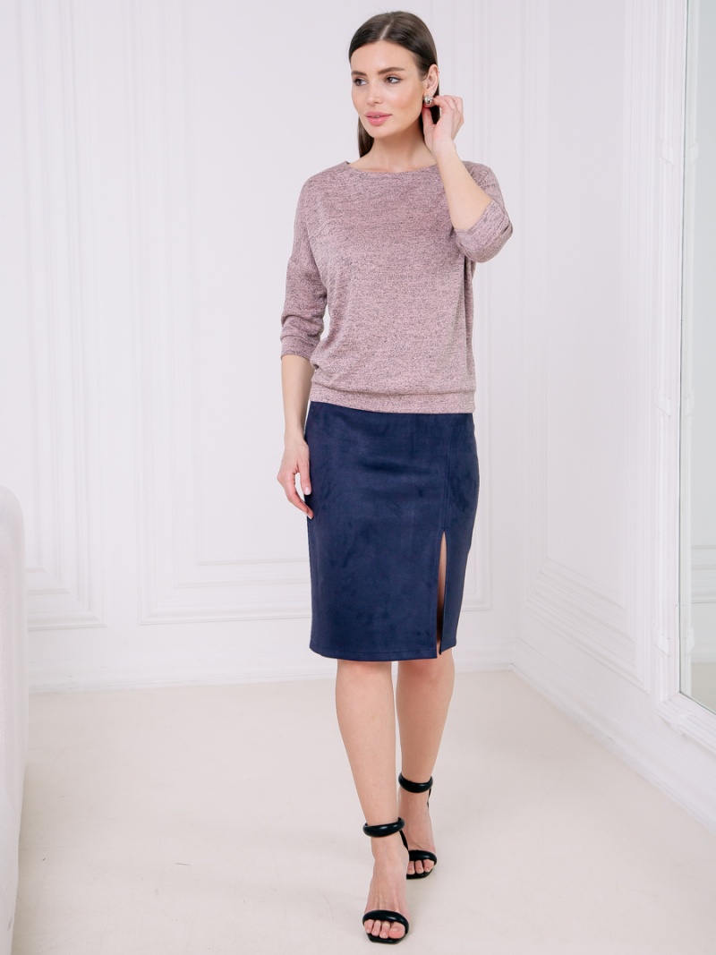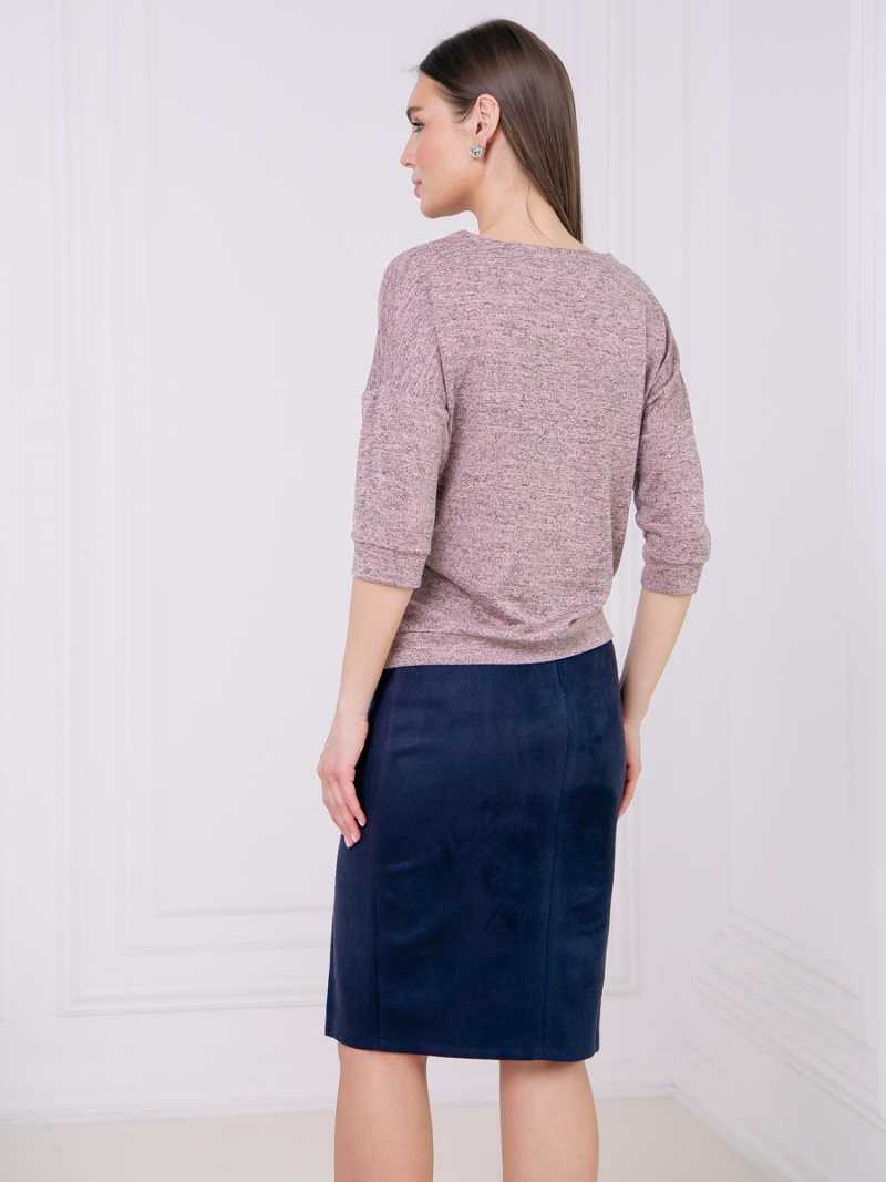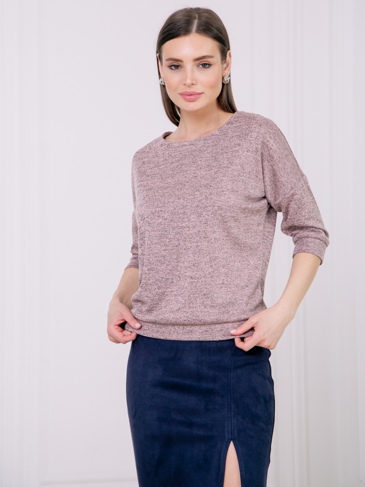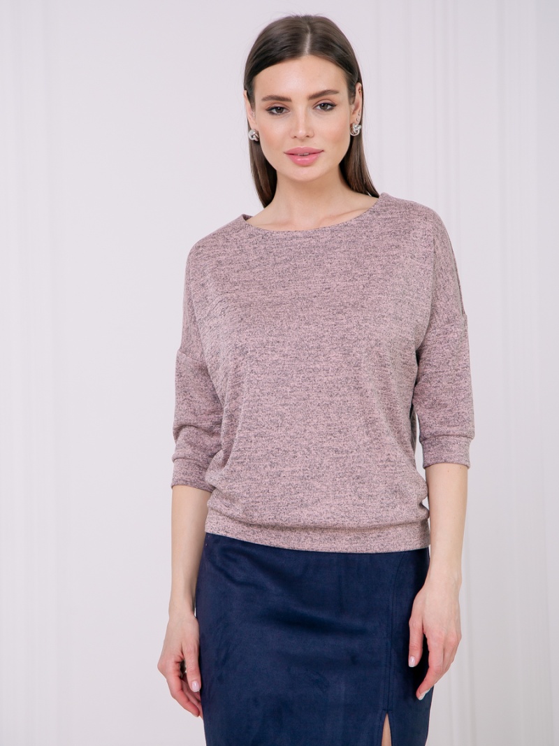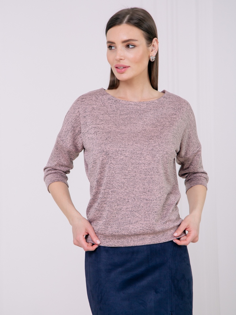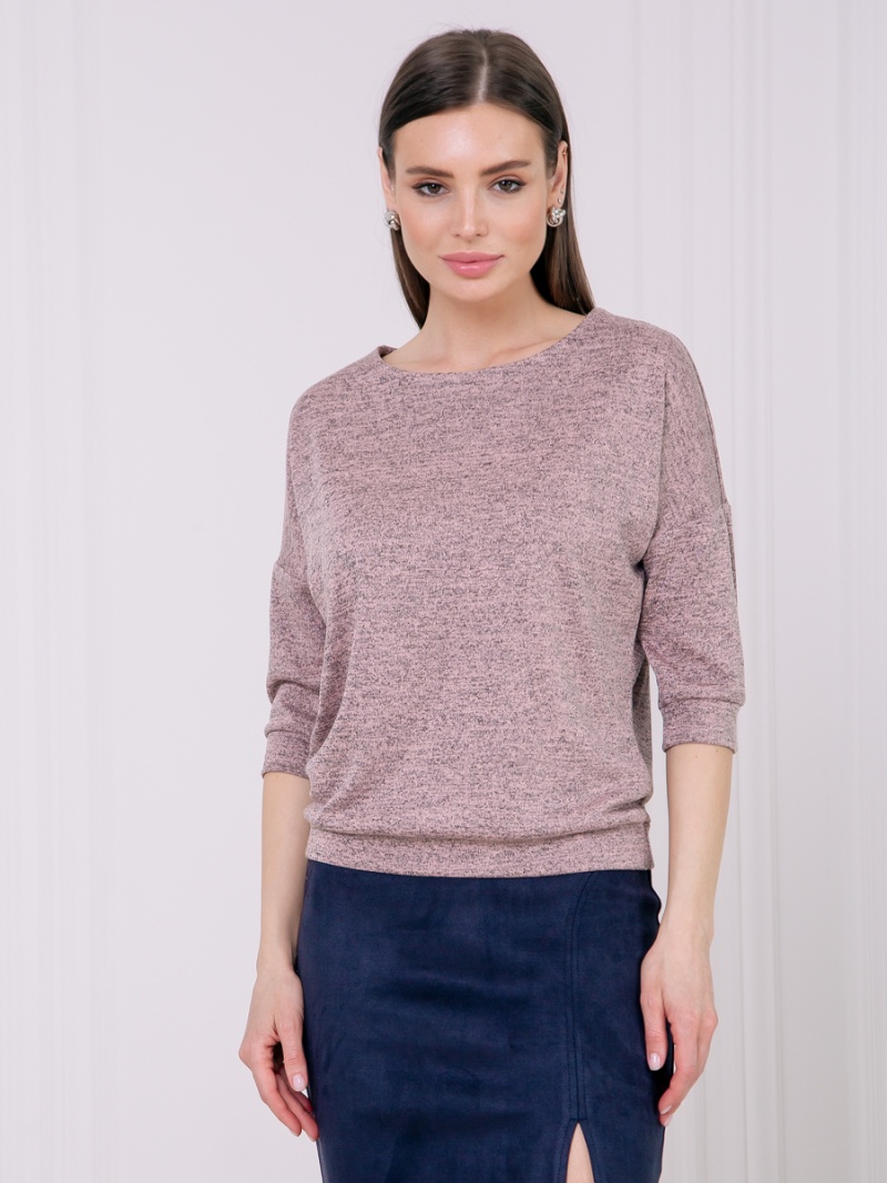 Джемпер из тонкого трикотажа. Покрой свободный, плечо немного спущено, за счет чего джемпер красиво драпируется на фигуре и подчеркивает женственность силуэта. Рукав три четверти с манжетой. Низ джемпера собран на пояс, свободно лежащий на бедрах. Длина по спинке 57 см.
