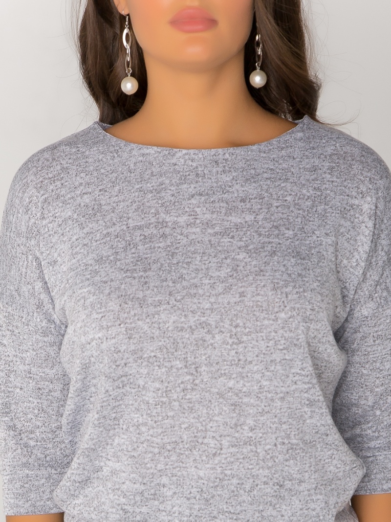 Джемпер из тонкого плотного меланжевого трикотажа. Покрой свободный, плечо немного спущено, за счет чего джемпер красиво драпируется на фигуре и подчеркивает женственность силуэта. Рукав три четверти с манжетой. Низ джемпера собран на пояс, свободно лежащий на бедрах. Длина по спинке 57 см.