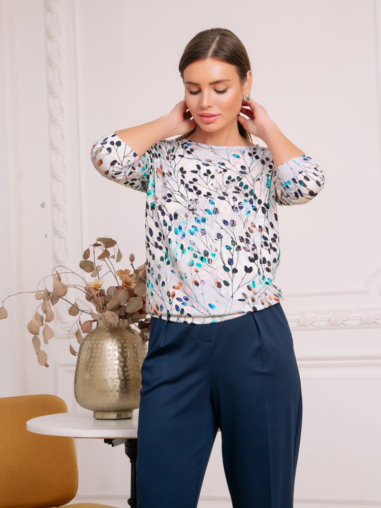 Джемпер из тонкого трикотажа с принтом. Покрой свободный, плечо немного спущено, за счет чего джемпер красиво драпируется на фигуре и подчеркивает женственность силуэта. Рукав с манжетой до локтя. Низ джемпера собран на пояс, свободно лежащий на бедрах. Длина по спинке 57 см. Будь стильной вместе с одеждой Вишня.