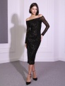 Платье с открытыми плечами приталенного силуэта из паетки на трикотажной подкладке длины миди. Рукав длинный. По заднему шву снизу разрез. Длина по спинке 109 см, длина рукава по внутреннему шву 43см. Будь стильной вместе с одеждой Вишня!