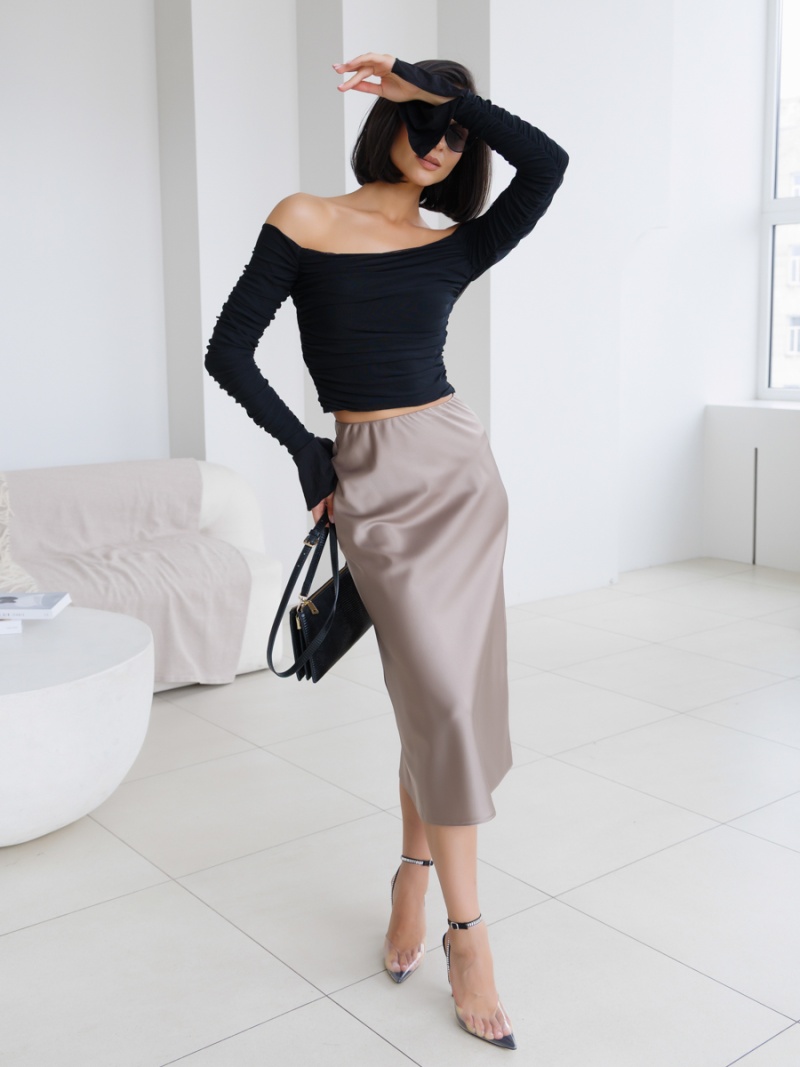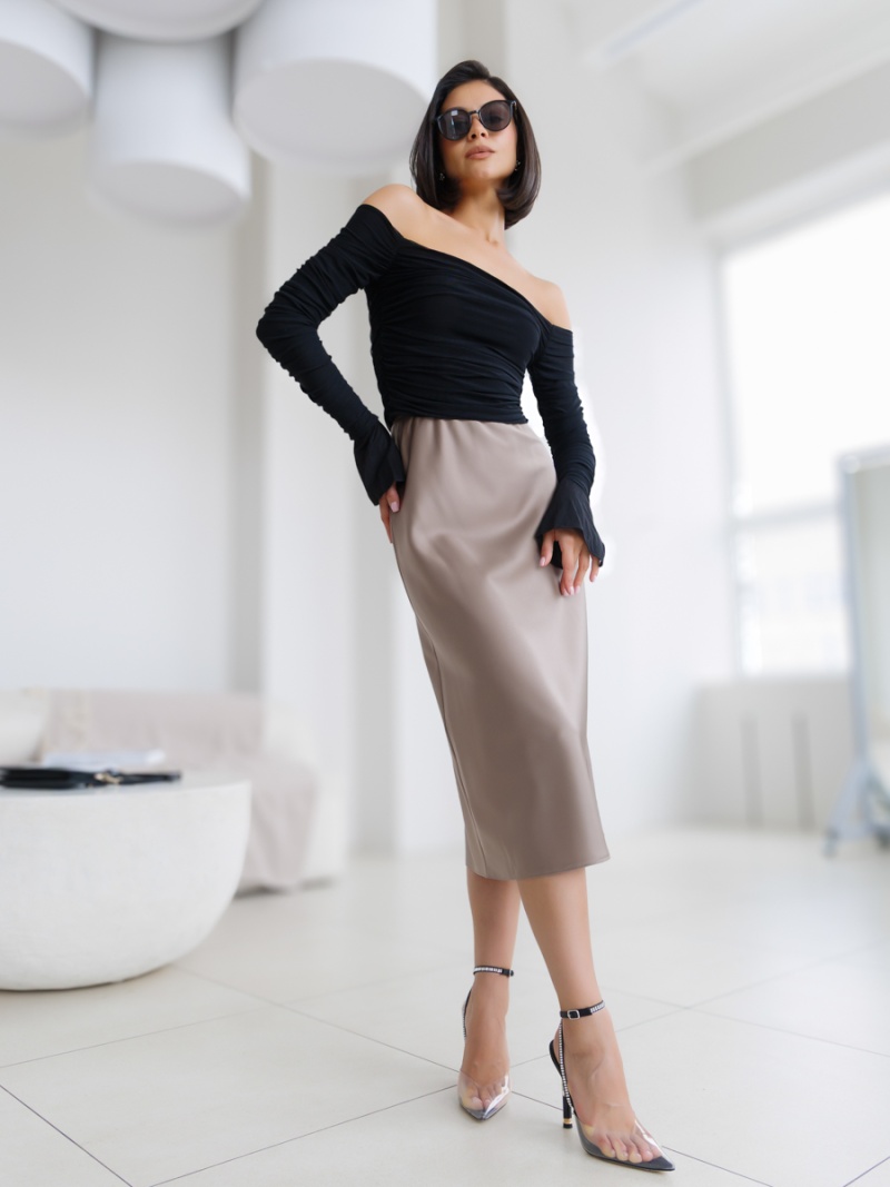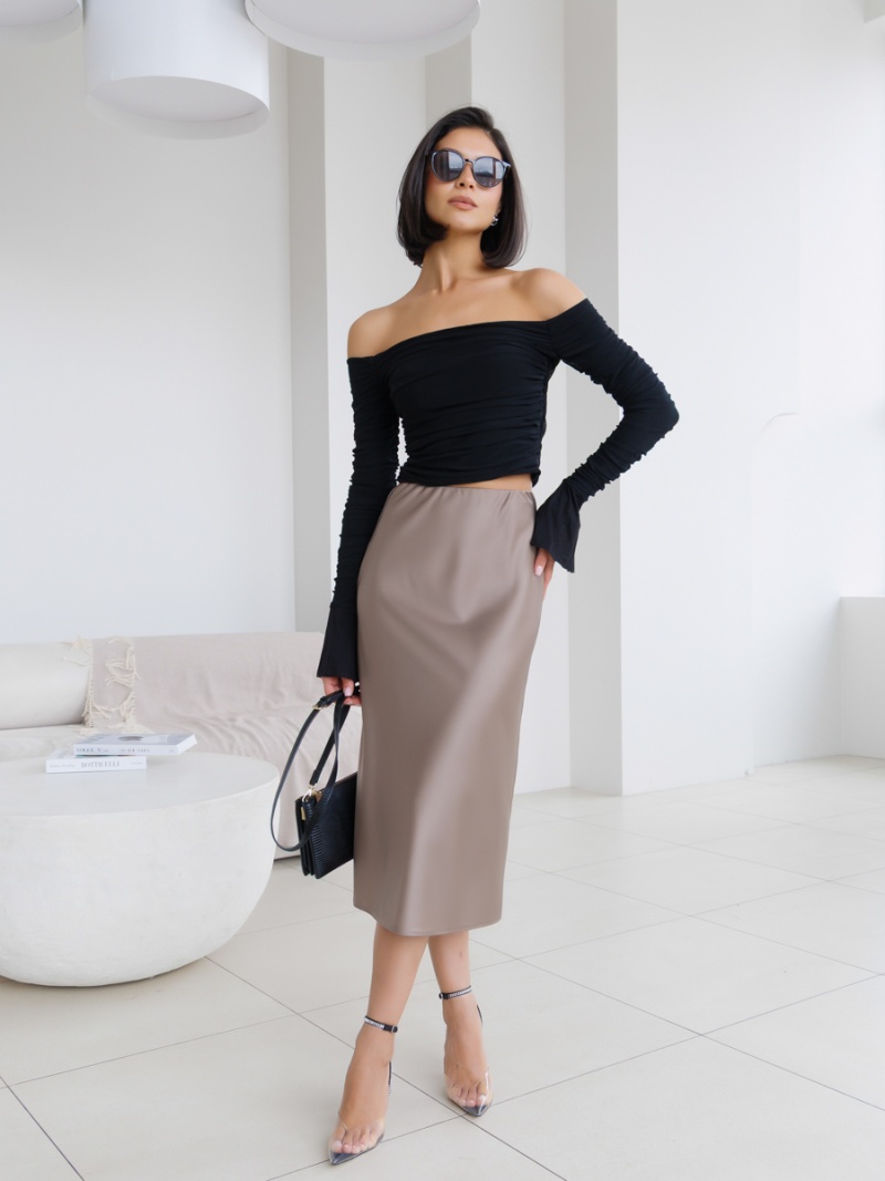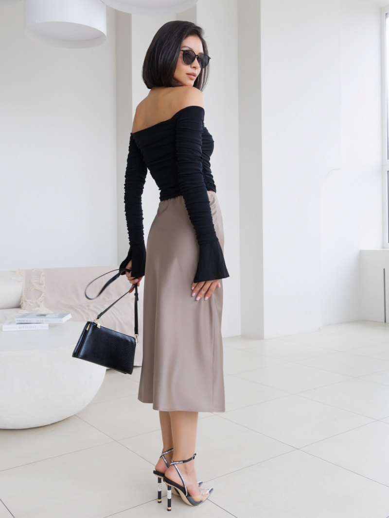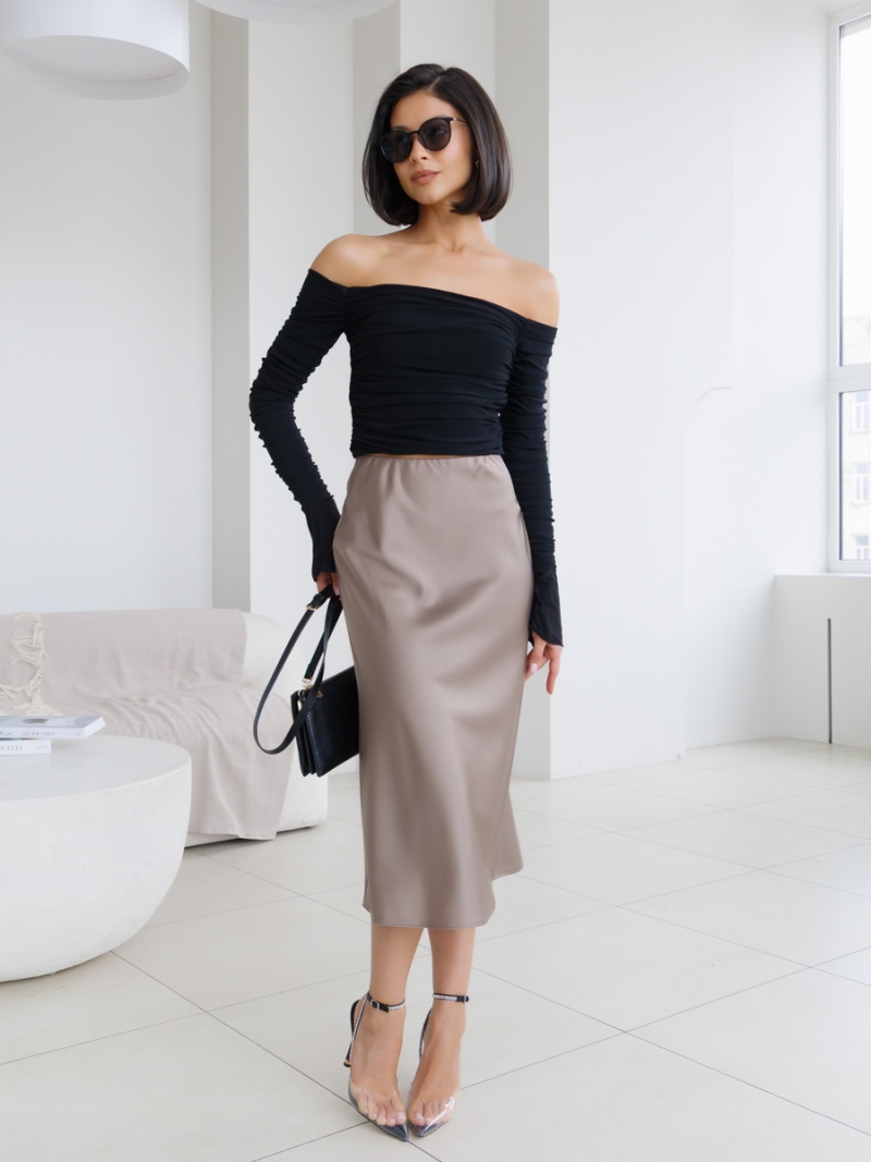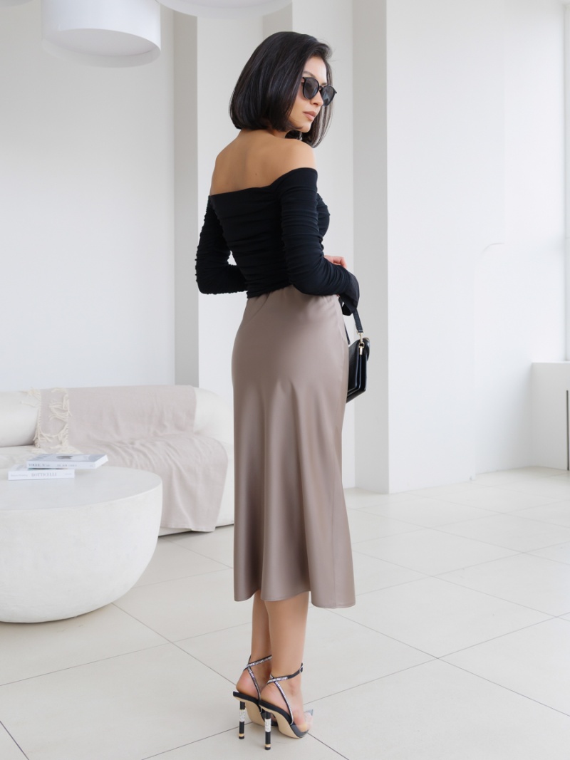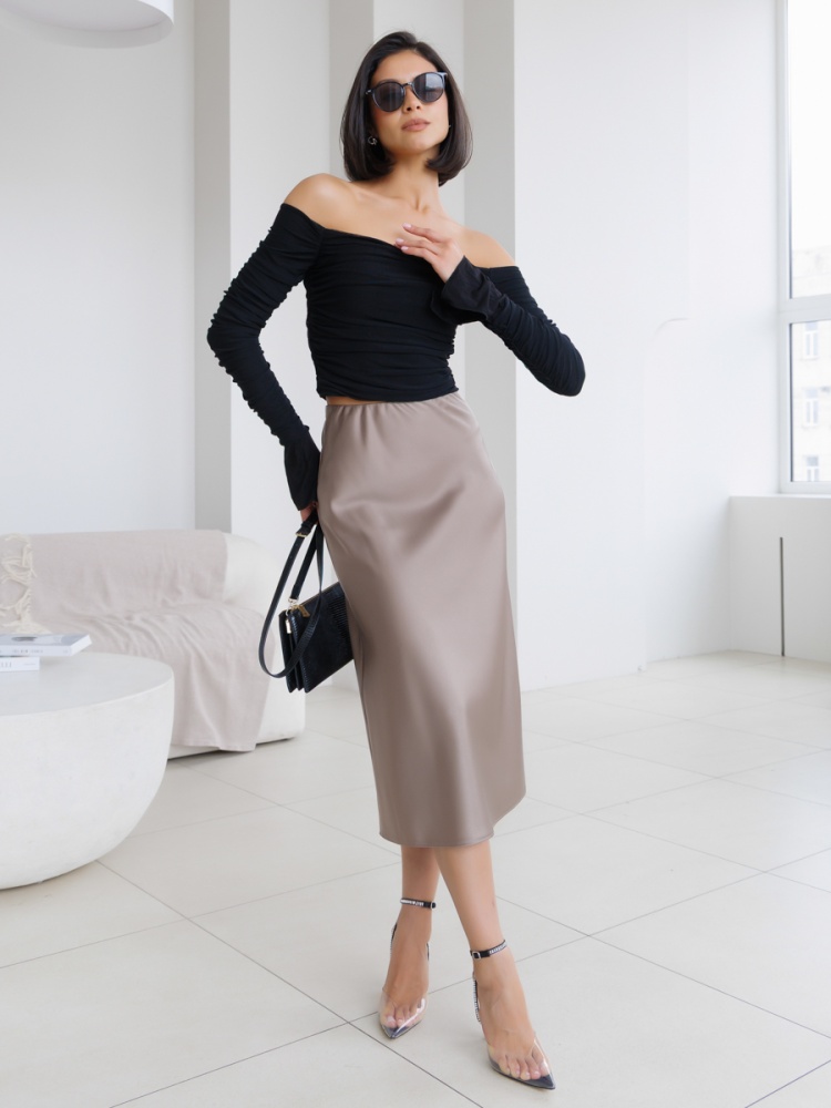 Юбка-колокол на резинке из однотонного шелка-атласа длиной ниже колена. Длина изделия 73см. Будь стильной вместе с одеждой Вишня!