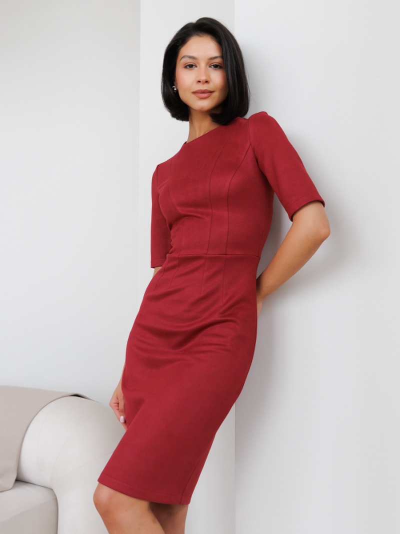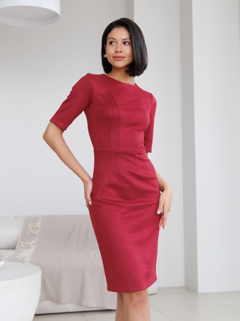 Платье-футляр из эластичной эко-замши. Замша незначительно растягивается и за счет этого платье идеально садится по фигуре. Рукав втачной до локтя, отрезная линия талии. Застежка сзади на молнию. По переду декоративные рельефы. Длина по спинке 98 см. Будь стильной вместе с одеждой Вишня!