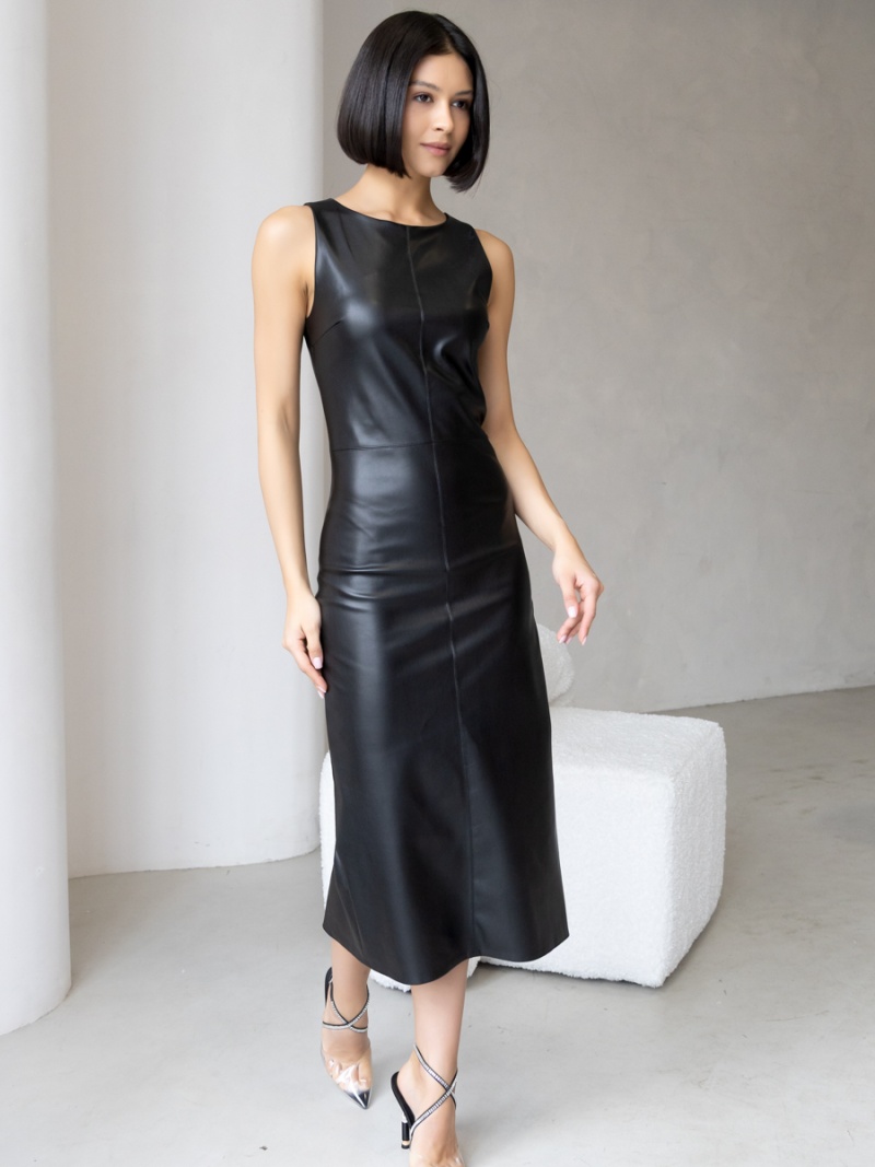 Платье-футляр длины миди с разрезом сзади из эластичной эко-кожи с замшевой изнанкой . Кожа незначительно растягивается и за счет этого платье идеально садится по фигуре. Без рукава, отрезная линия талии. Застежка на молнию в боковом шве. Длина по спинке 119 см. Будь стильной вместе с одеждой Вишня!