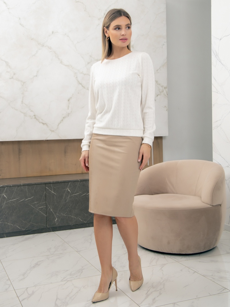 Юбка-карандаш из эластичной эко-кожи бежевого цвета стилизованная под змею. На спинке застежка-молния и разрез. Верх юбки на поясе, посадка четко по талии. Длина по спинке 64 см. Будь стильной вместе с одеждой Вишня!