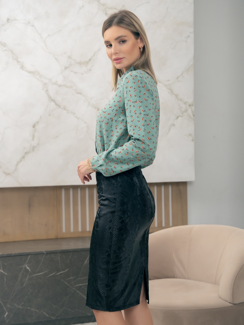 Юбка-карандаш из эластичной эко-кожи стилизованная под змею черного цвета. На спинке застежка-молния и разрез. Верх юбки на поясе, посадка четко по талии. Длина по спинке 65 см. Будь стильной вместе с одеждой Вишня!