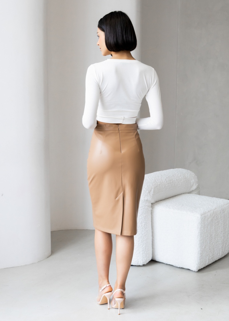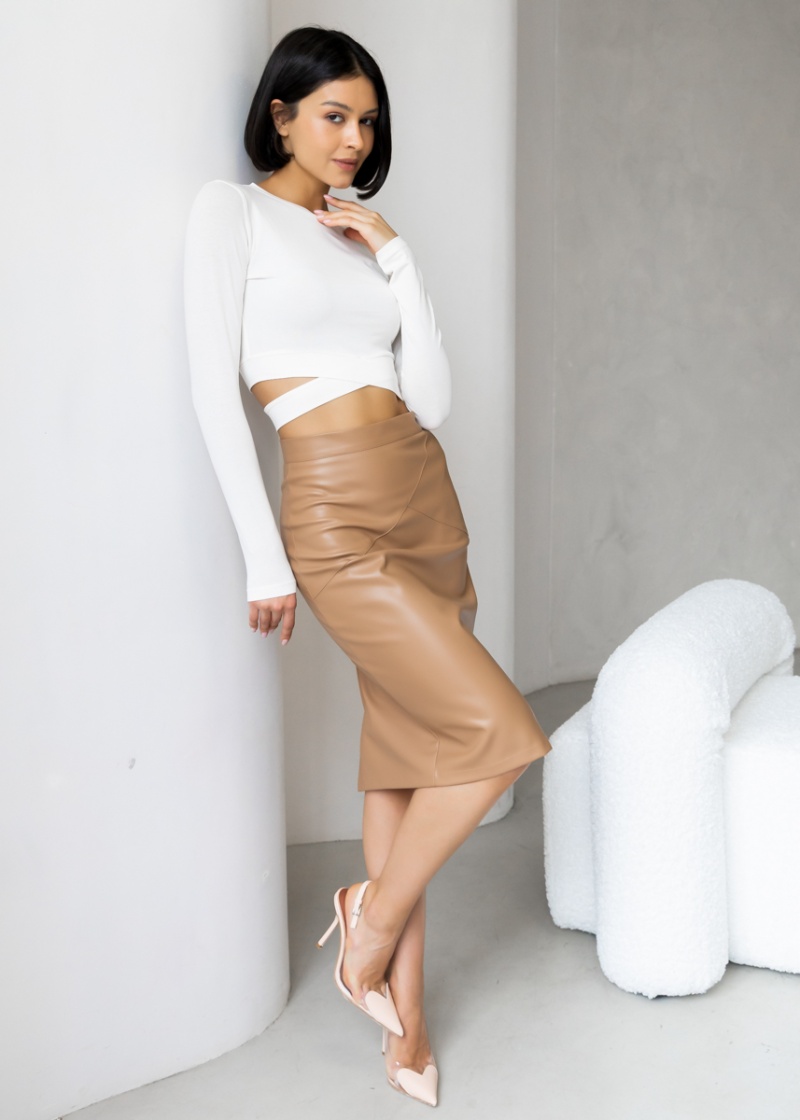 Юбка-карандаш облегающего силуэта. Выполнена из эластичной эко-кожи, которая незначительно растягивается и за счет этого идеально садится по фигуре. Верх юбки на поясе, посадка четко по талии. Шлица по среднему шву спинки. Застежка на молнию. Длина по спинке 64 см. Будь стильной вместе с одеждой Вишня!