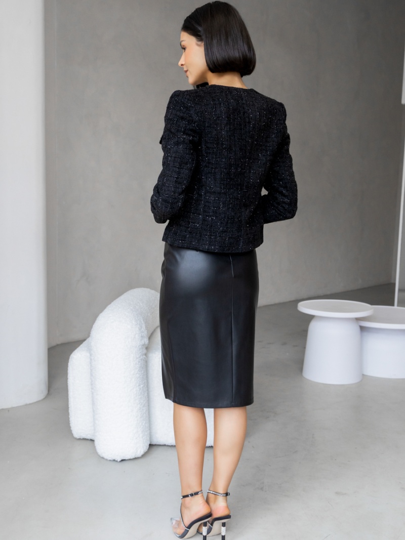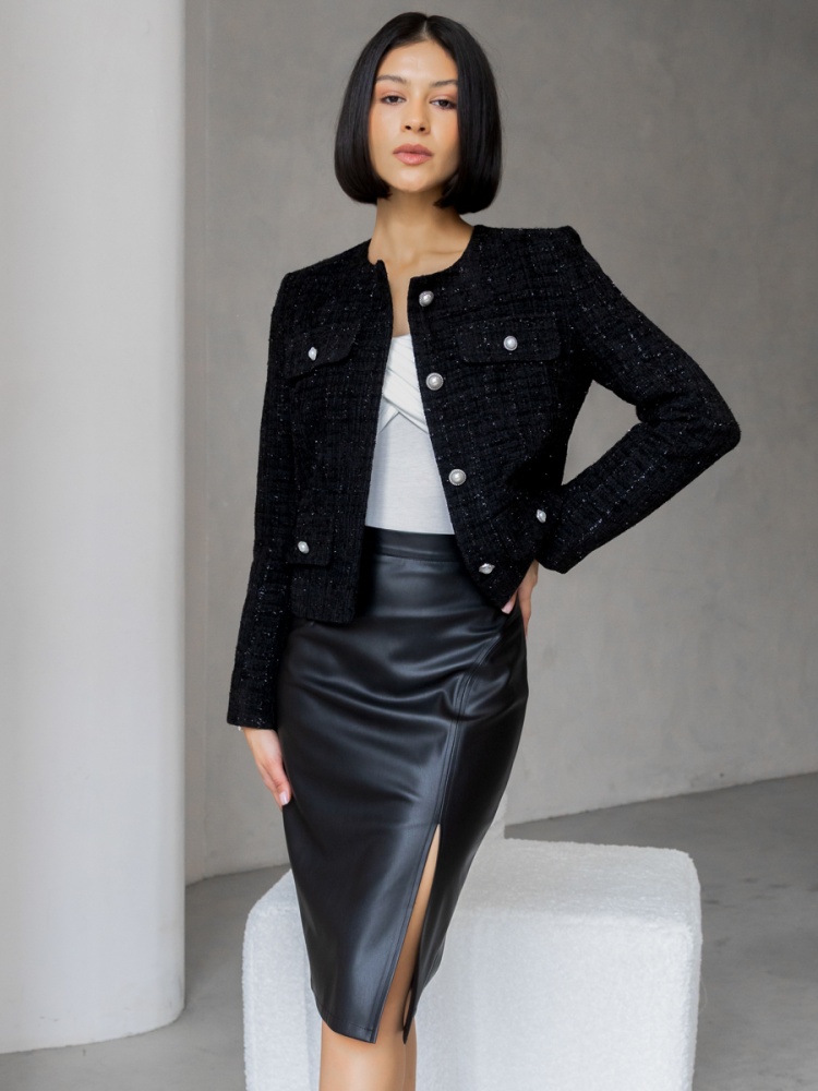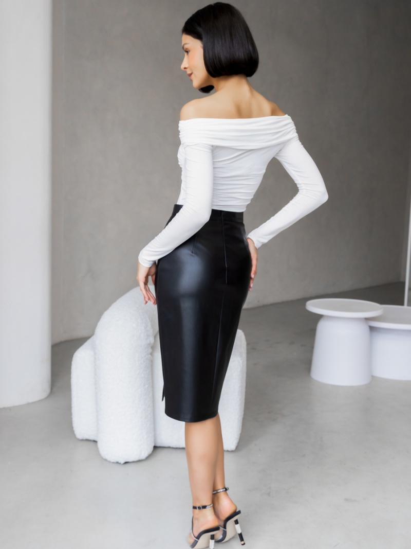 Юбка-карандаш облегающего силуэта. Выполнена из плотной и эластичной эко-кожи, которая незначительно растягивается и за счет этого идеально садится по фигуре. Верх юбки на поясе, посадка четко по талии. Разрез в левом рельефном шве. На спинке застежка-молния. Длина по спинке 64 см. Будь стильной вместе с одеждой Вишня!