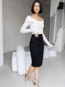 Юбка-карандаш из эластичной эко-замши черного цвета. На спинке застежка-молния и разрез. Верх юбки на поясе, посадка четко по талии. Длина по спинке 65 см.