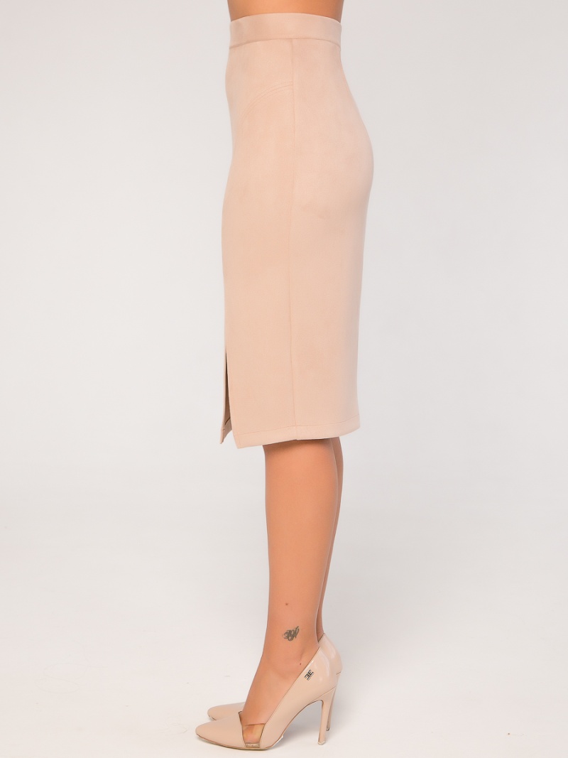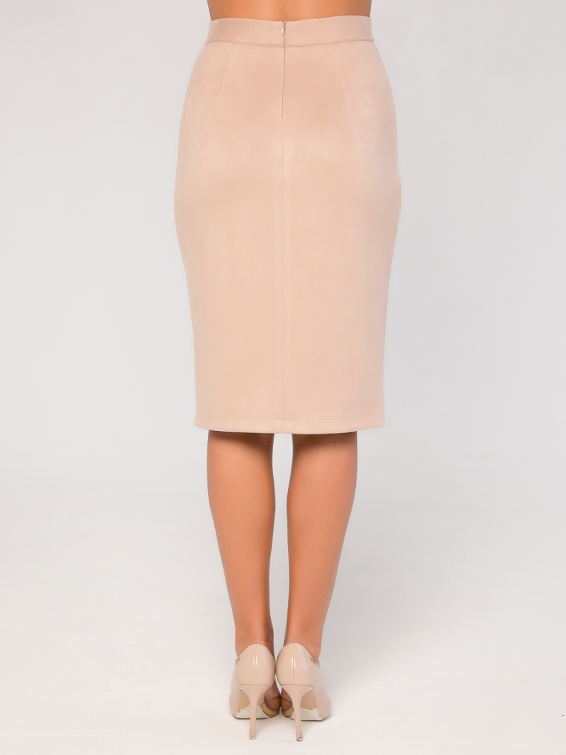 Юбка-карандаш облегающего силуэта. Выполнена из плотной и эластичной эко-замши, которая незначительно растягивается и за счет этого идеально садится по фигуре. Верх юбки на поясе, посадка четко по талии. Разрез в левом рельефном шве. На спинке застежка-молния. Длина по спинке 62 см.